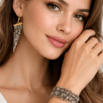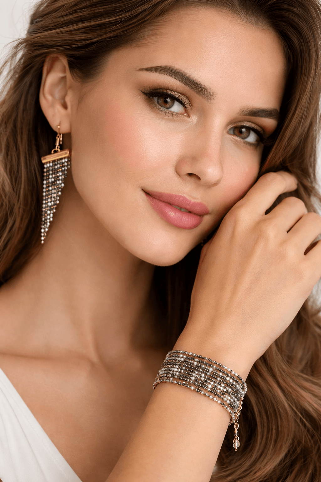 העגילים הארוכים נותנים נוכחות דרמטית אבל נשארים קלילים ונעימים, והצמיד במראה שכבות עוטף את הלוק בנצנוץ עדין אך בלתי מתפשר.