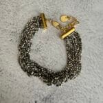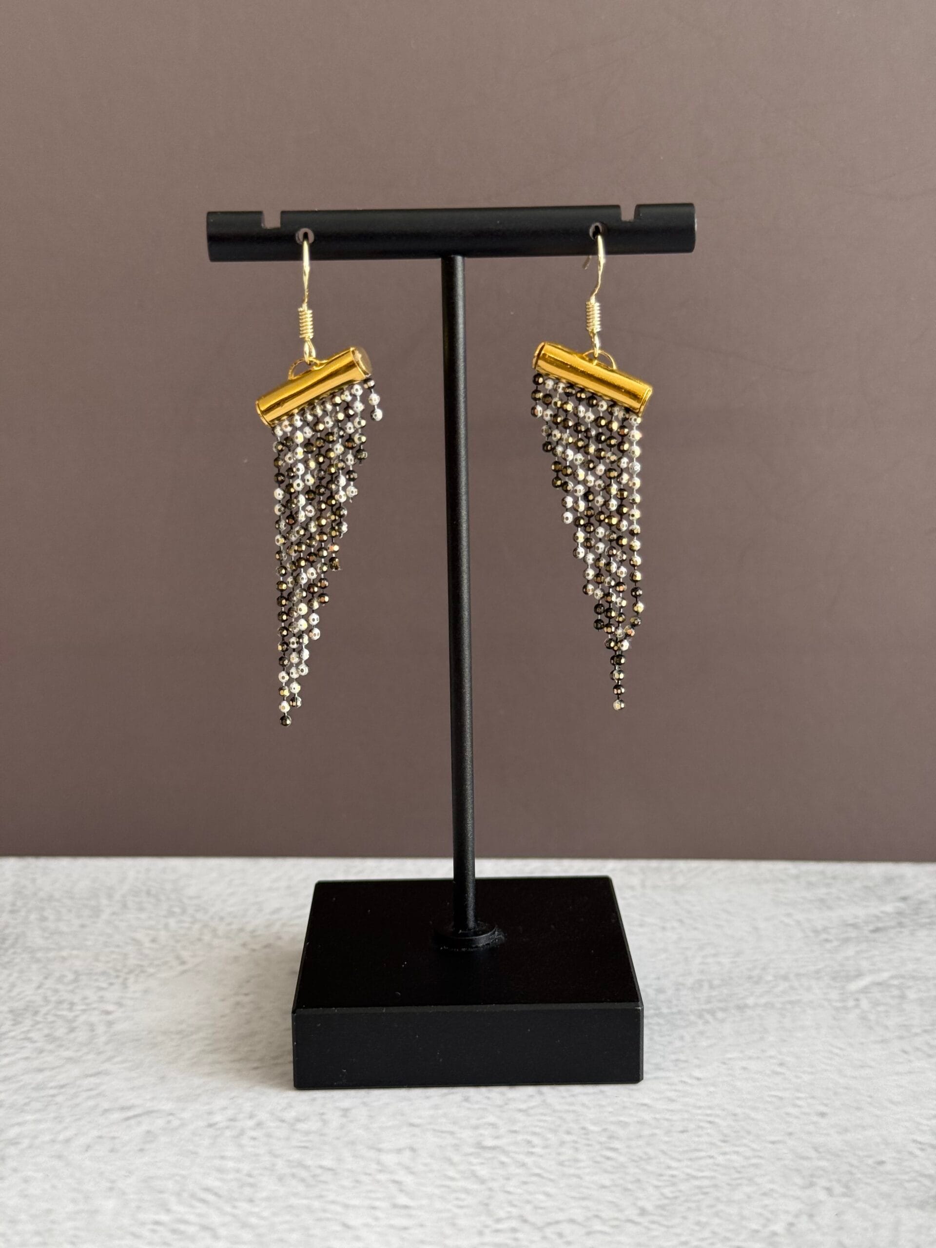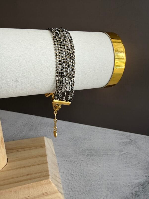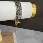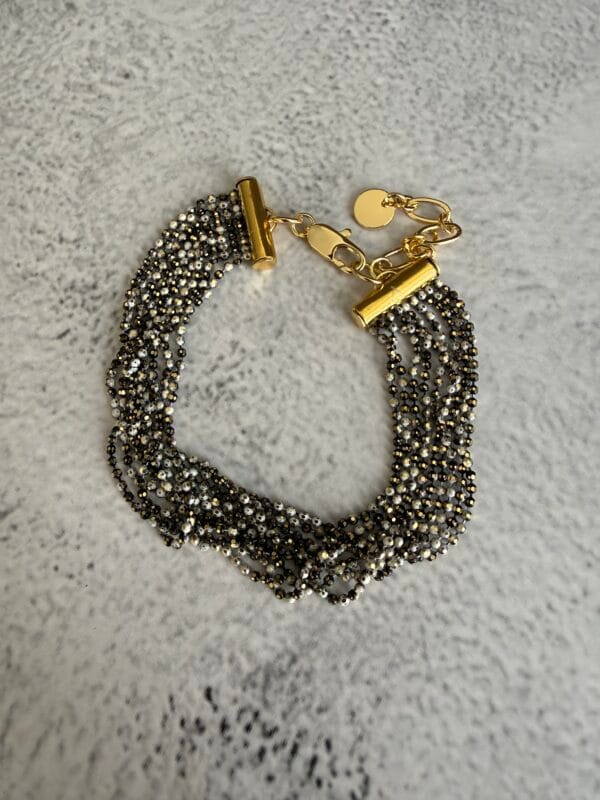 שילוב מדויק של שרשרת בגוונים מטאליים שחור, לבן ונגיעות זהב שיוצרים תנועה זורמת, כמעט כמו טיפות שנשפכות באלגנטיות.