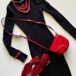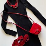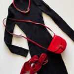 הלוק הזה הוא שילוב מושלם של מינימליזם ונועזות שיוצרים לוק בסגנון אלגנטי, עם נגיעות של צבעים בולטים, המשלבים בין שחור קלאסי לאדום נועז. השמלה הצמודה השחורה עם שרוולים ארוכים יוצרת מראה מתוחכם, ואביזרים אדומים כמו התיק, הנעליים והתכשיטים מוסיפים ניגודיות חזקה ואלמנט של דרמטיות.