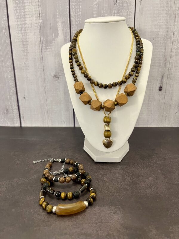 שרשראות בשכבות מחומרים טבעיים, חרוזי טייגר איי (Tiger's Eye) בגווני חום-זהוב אלמנטים מעץ בצורה גיאומטרית ותליון לב מתכתי המוסיף נגיעה רומנטית.