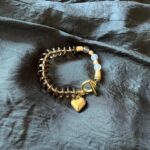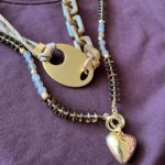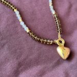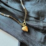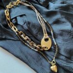 השרשראות בגווני זהב יוצרות מוקד עניין מרכזי. השילוב של שרשרת עבה מלאה נוכחות עם שרשרת חרוזים ארוכה ותליון לב מוסיף עומק ומורכבות למראה.