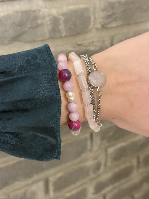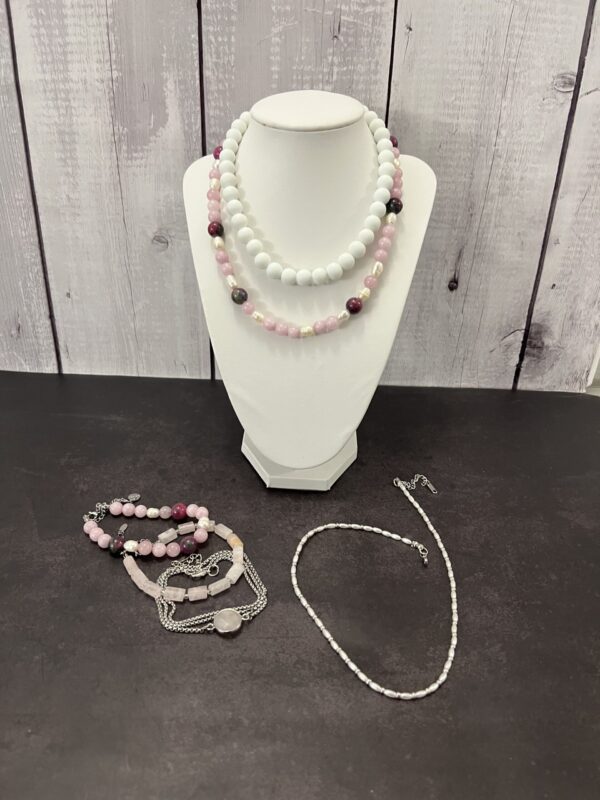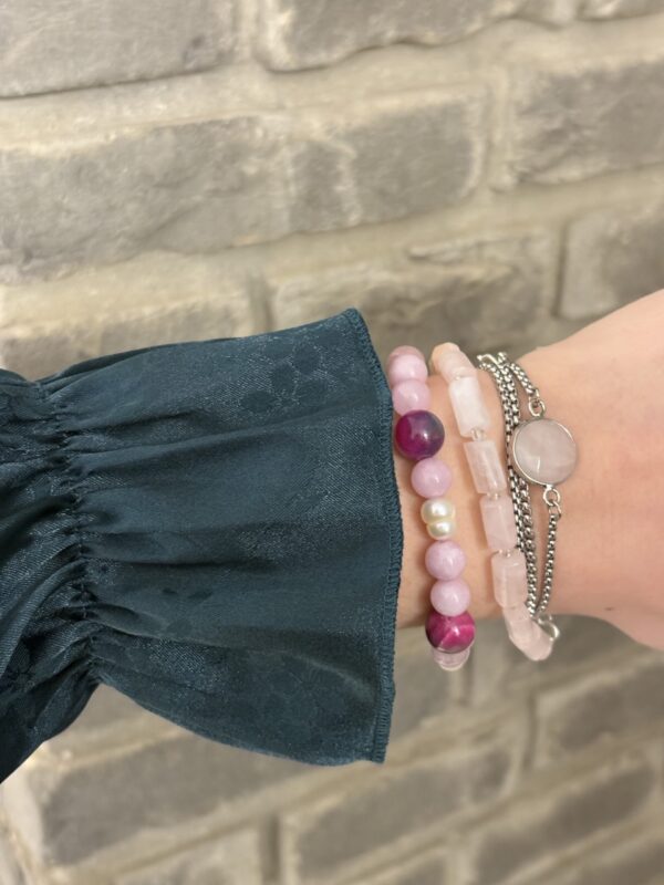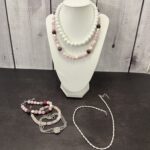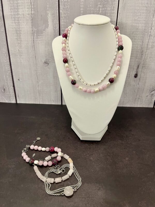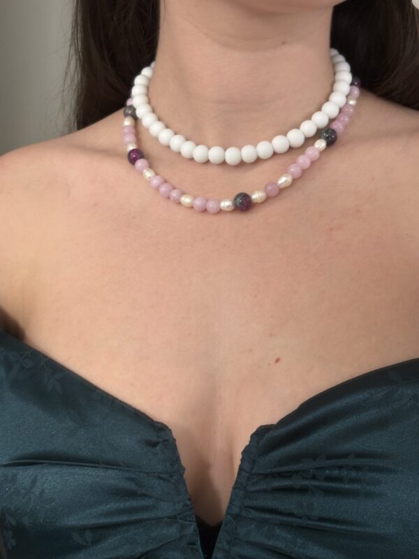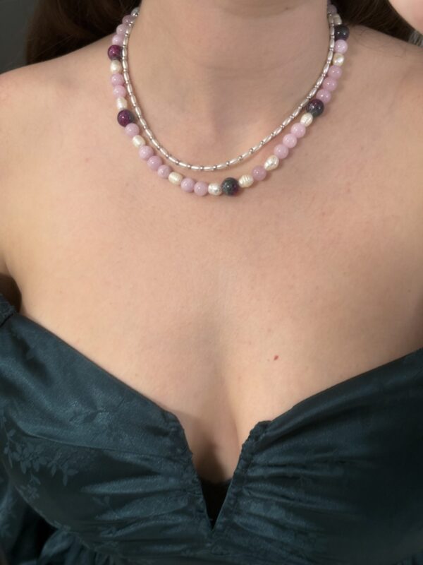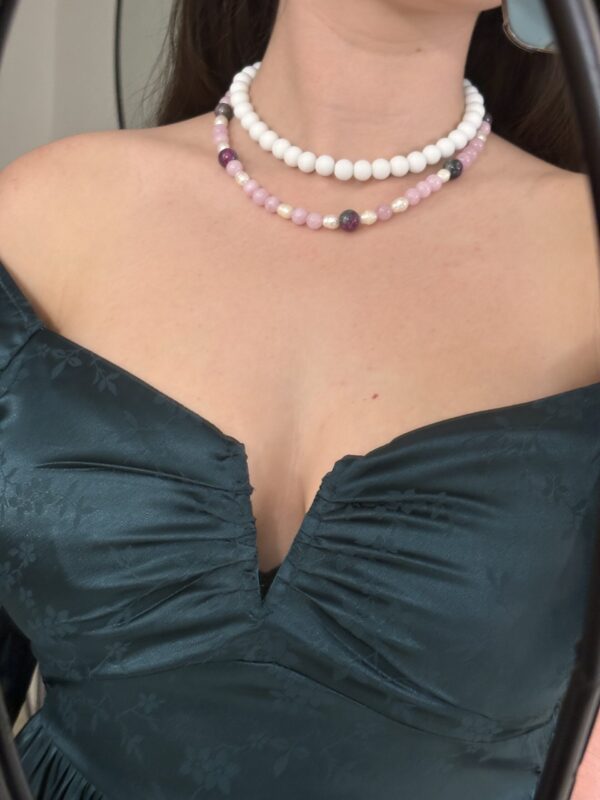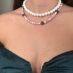 הלוק הזה בנוי משרשראות וצמידים המשלבים פנינים עדינות ומחרוזת אגת עם אבני חן ורודות. שילוב זה יוצר מראה שמשלב בין אלגנטיות קלאסית לבין רוך וטבעיות. לתכשיטים אלו מתאימים פריטי לבוש בגוונים נייטרליים כמו לבן, שמנת ואפור, שידגישו את יופיים. למראה מתוחכם, ניתן לשלב אותם עם שמלה בגוון ירוק עמוק ורוד עתיק או בורדו, התואמים את הצבעים בתכשיטים.