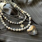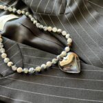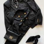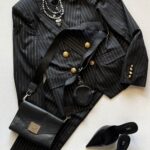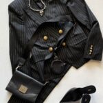חליפת פסים דקה: מעניקה מראה קלאסי ואלגנטי, עם נגיעה מחויטת. הכפתורים המוזהבים מוסיפים אלמנט יוקרתי. תיק עור שחור עם רצועה רחבה: פרקטי ונוח, אך עדיין מאוד מסוגנן – נעלי עקב מחודדות שחורות: מוסיפות אורך לרגליים ומשדרות אלגנטיות, תכשיטים ״כבדים״ (שרשרת פנינים ושחור): מעניקים עומק ועניין ללוק ומדגישים את האזור העליון של הגוף.