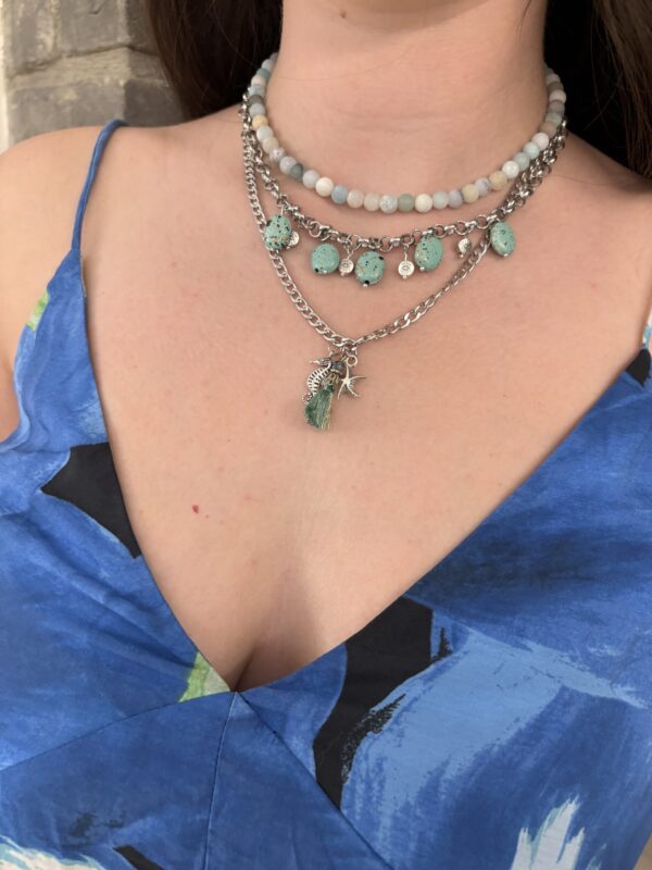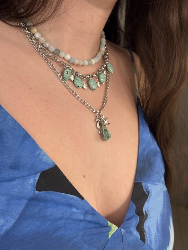 המראה משלב אלמנטים בהשראת הים, כמו גווני טורקיז ותכלת, לצד עיטורים מתכתיים כסופים שמעניקים לו מגע עכשווי. התכשיטים יוצרים שילוב בין תחושת קלילות קז’ואלית לאלגנטיות מעודנת, מה שהופך את הלוק למתאים גם ליציאות יום-יומיות וגם לאירועים נינוחים בערב. ניתן לשלב עם שמלת פשתן לבנה, חולצת ג’ינס קלילה או אוברול בגוון חול טבעי, להשלמת מראה רענן וקיצי.