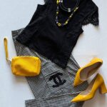 הלוק הזה משלב אלמנטים מתוחכמים וקלאסיים עם נגיעות מודרניות נועזות. המכנסיים המשובצים עם לוגו של שאנל משדרים יוקרה ואלגנטיות, ואילו הצבע הצהוב הבוהק של האביזרים כמו התיק, הנעליים והתכשיטים מוסיף טוויסט נועז ורענן. החולצה השחורה עם תחרה משדרת רומנטיות ועדינות.