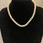 מחרוזת אלגנטית עשויה מחרוזי זכוכית שטוחים בגוון שמנת בשילוב חרוזי קריסטל צלולים.