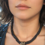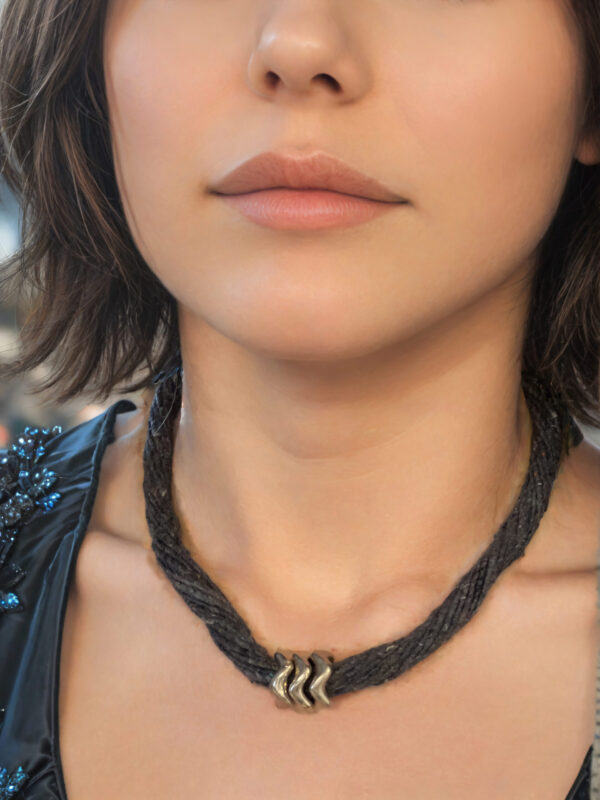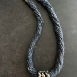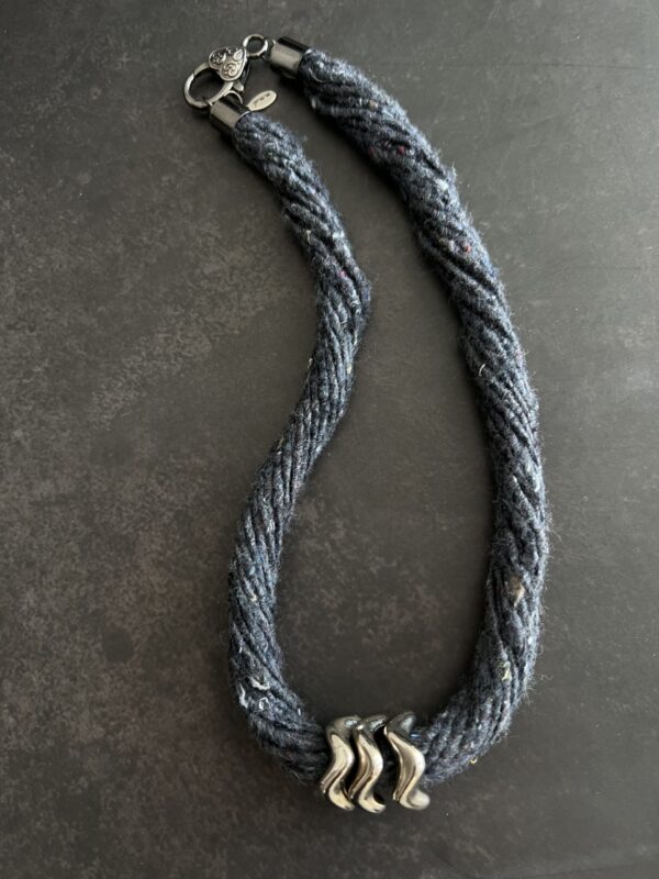 שרשרת עשויה מחבל רך ונעים למגע, בגוון אפור כהה בשילוב אלמט כסוף .