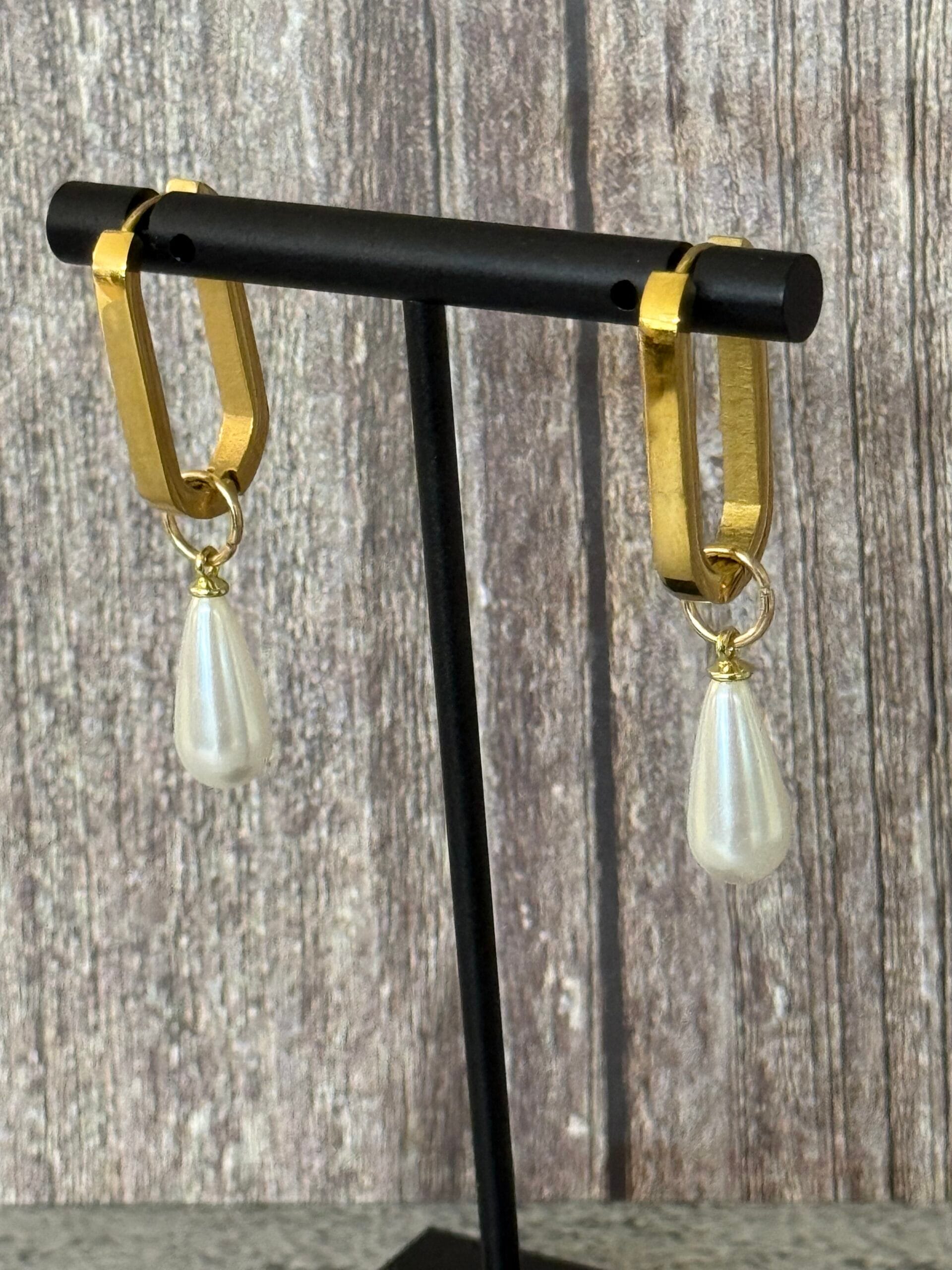 עגילי תלויים מרובעים ועליהם תליון פנינה