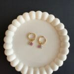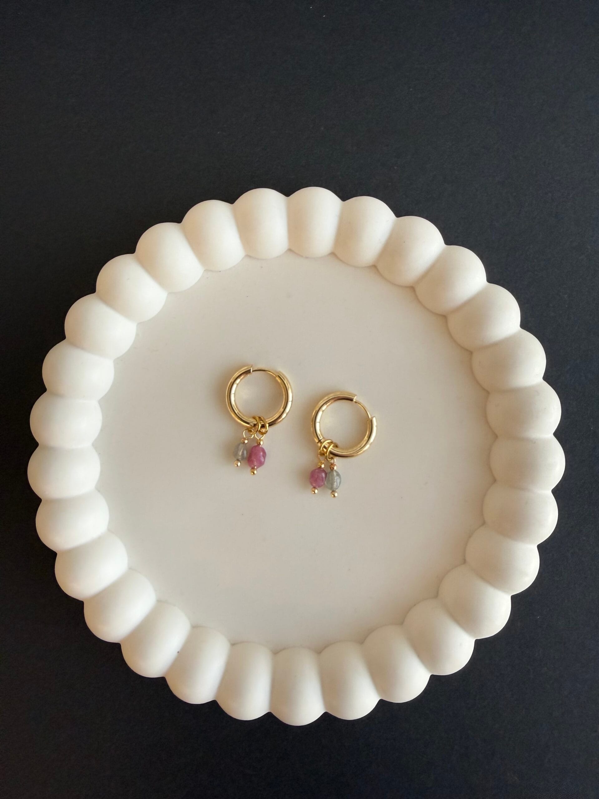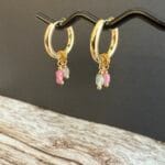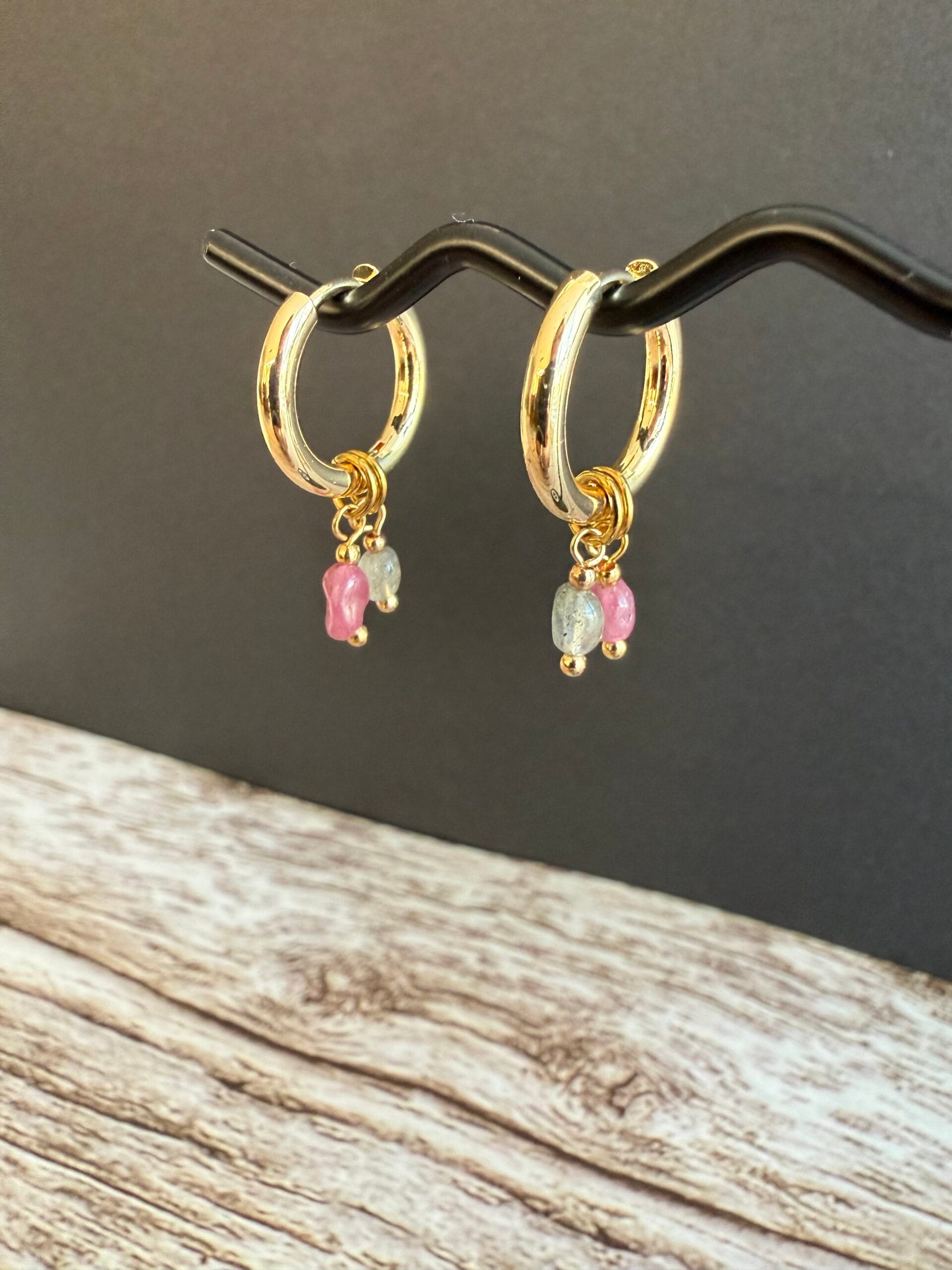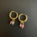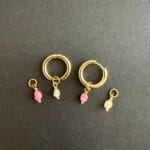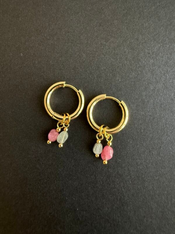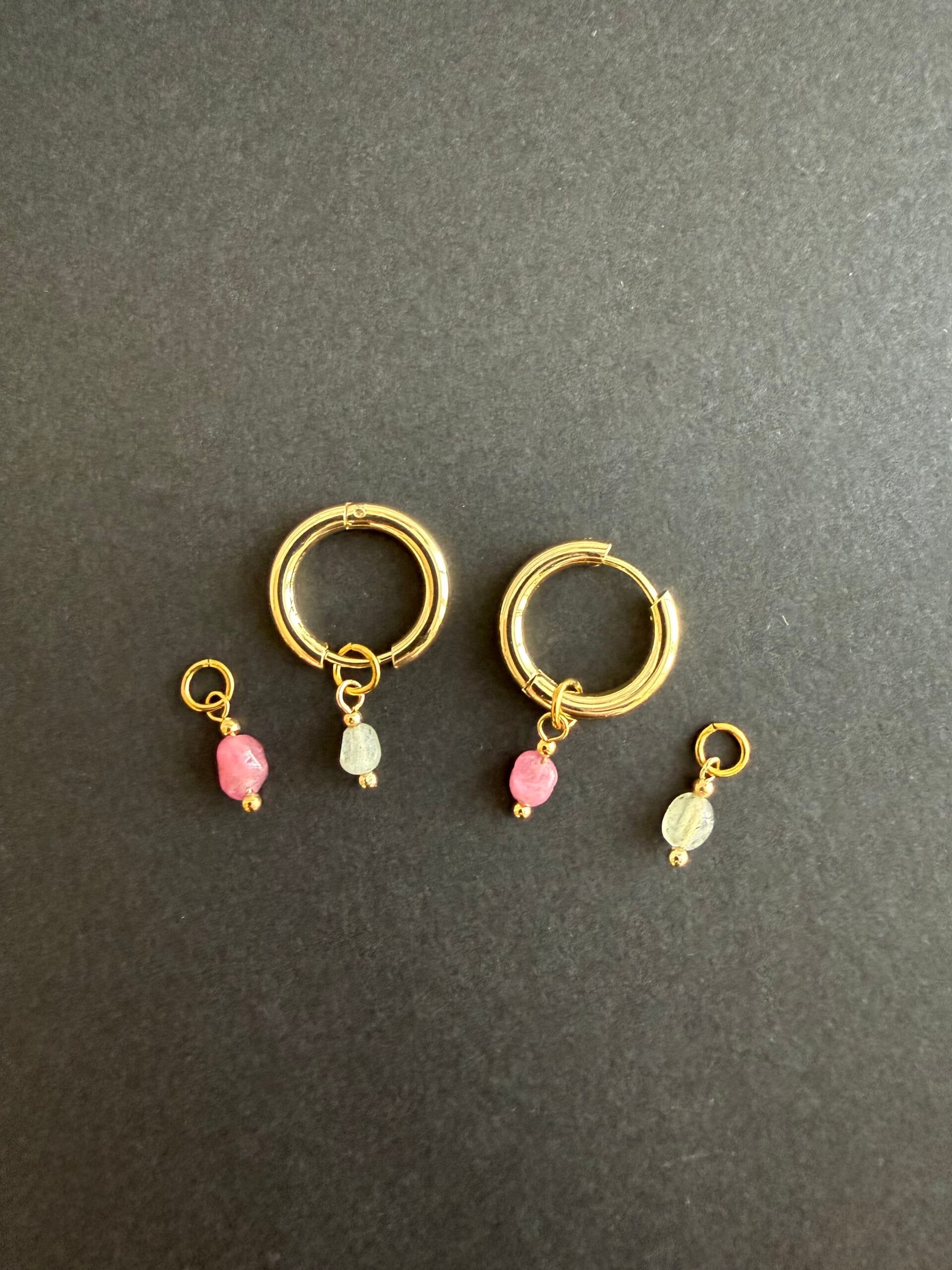 עגילי צ׳ארמס שימושיים ומיוחדים עשויים חישוק מצופה זהב ותליוני אבני חן קטנטנים בגווני ורוד ואפור במשקל קליל.