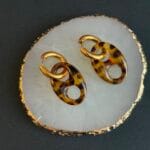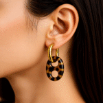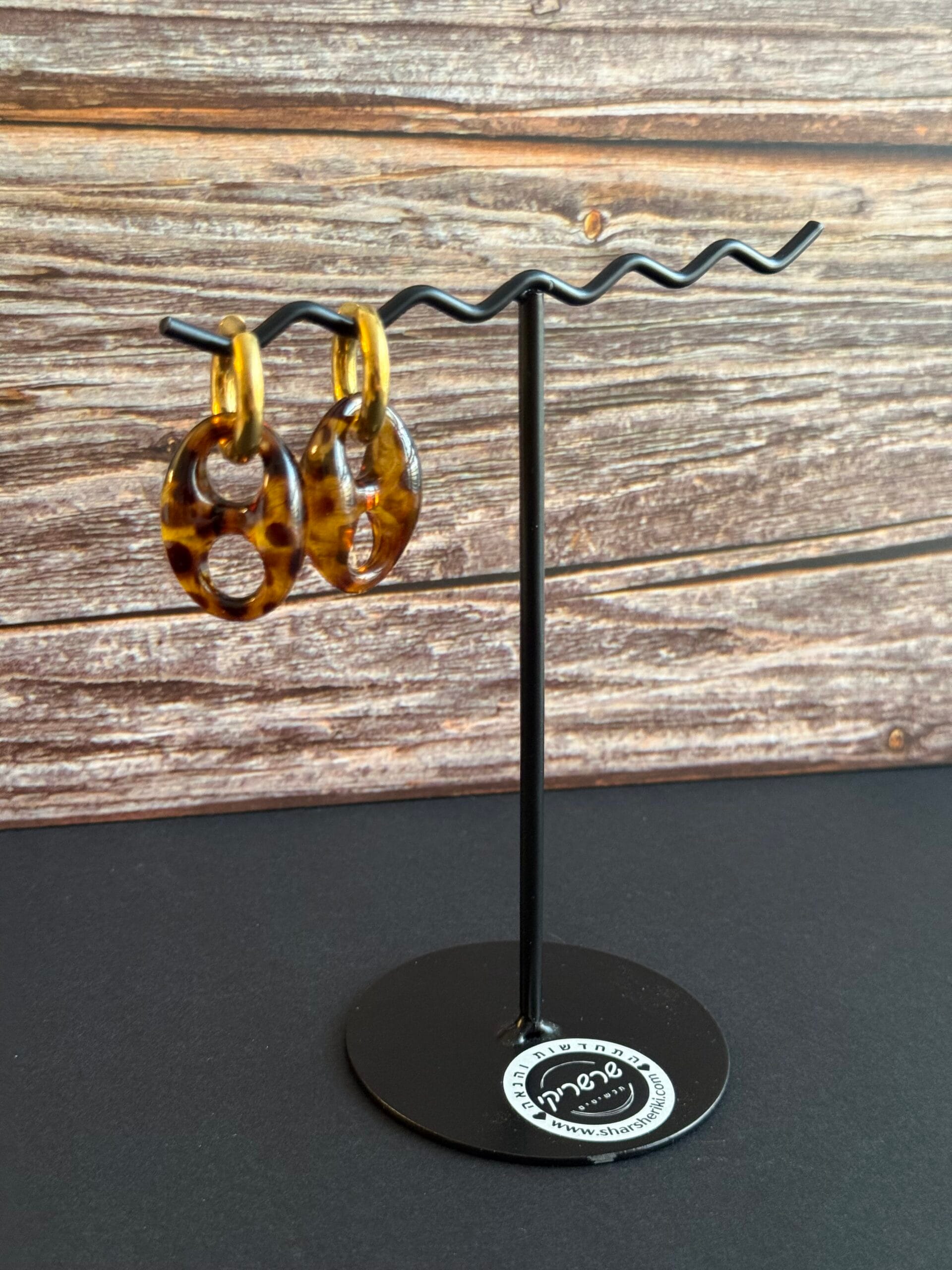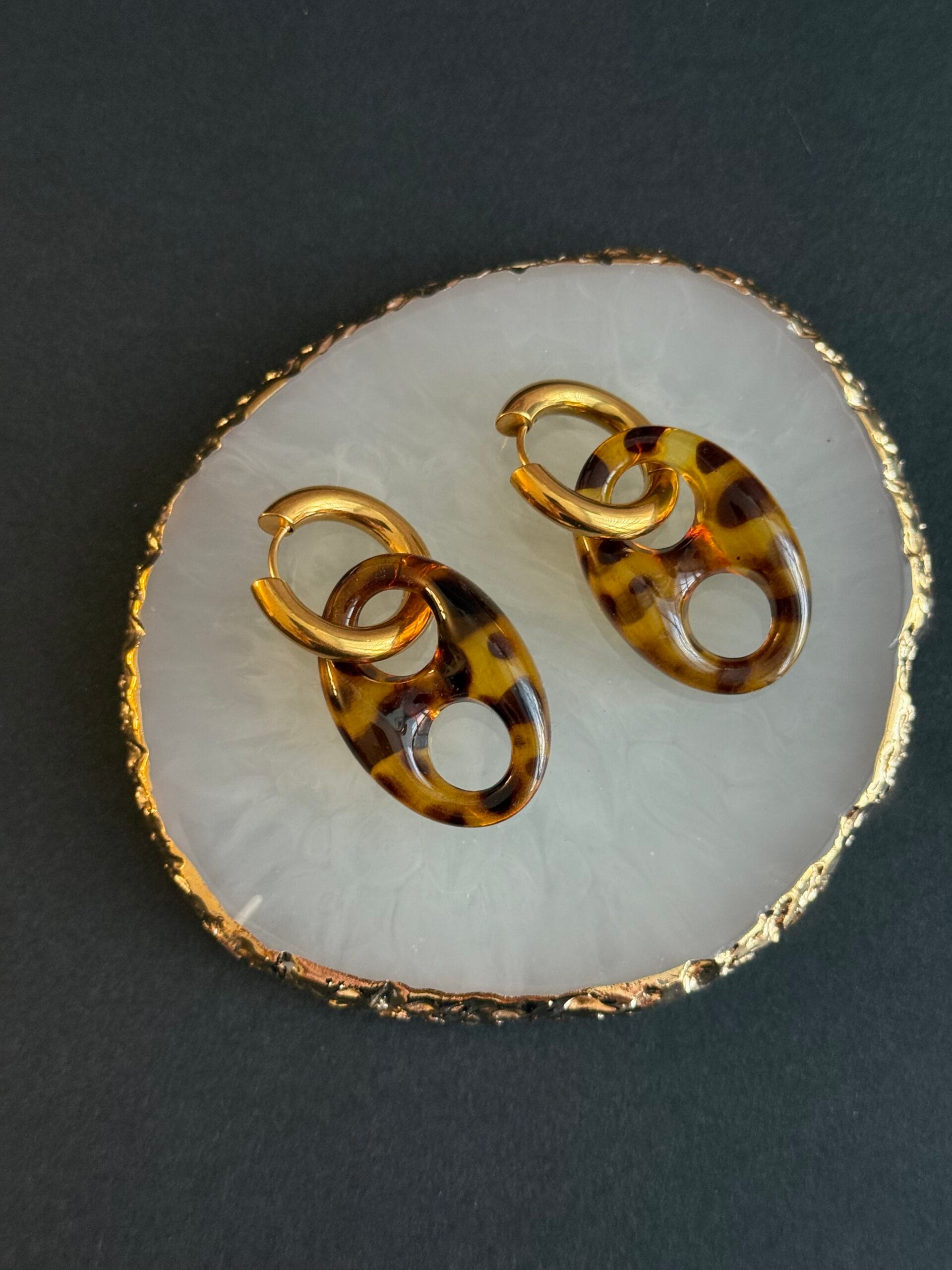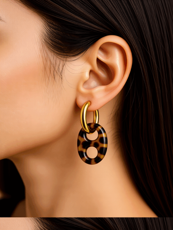 עגילי חישוק תלויים אל חלד בשילוב לולאות אקריל מנומרות בגווני חום ודבש.