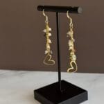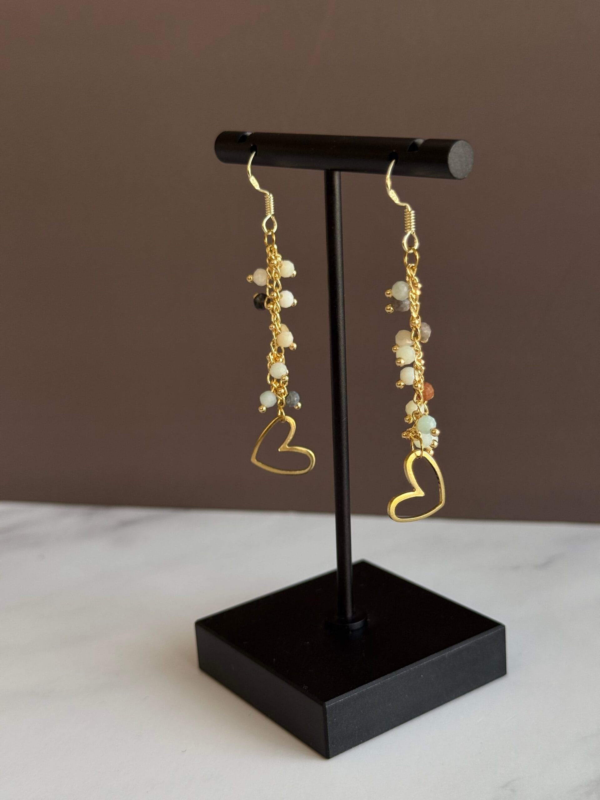 זוג עגילים תלויים אשכול אבני חן על עגיל כסף 925 מצופה זהב בציפוי איכותי, עם תליון לב מוזהב עדין .