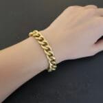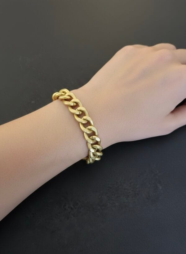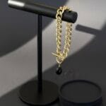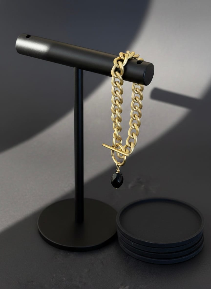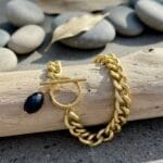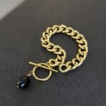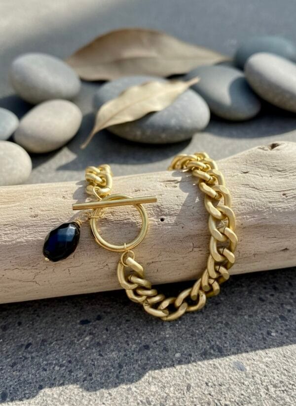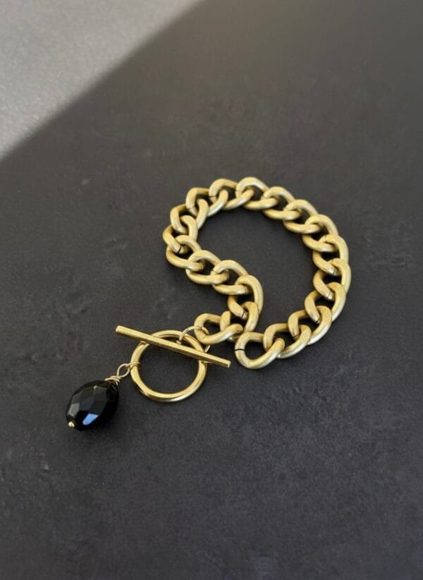 צמיד צ’אנקי גורמט בזהב מט עם לולאות גדולות וקלילות עשויות אלומניום בציפוי איכותי עם סגירה נוחה ואבן שחורה תלויה בגימור איכותי ועשיר.