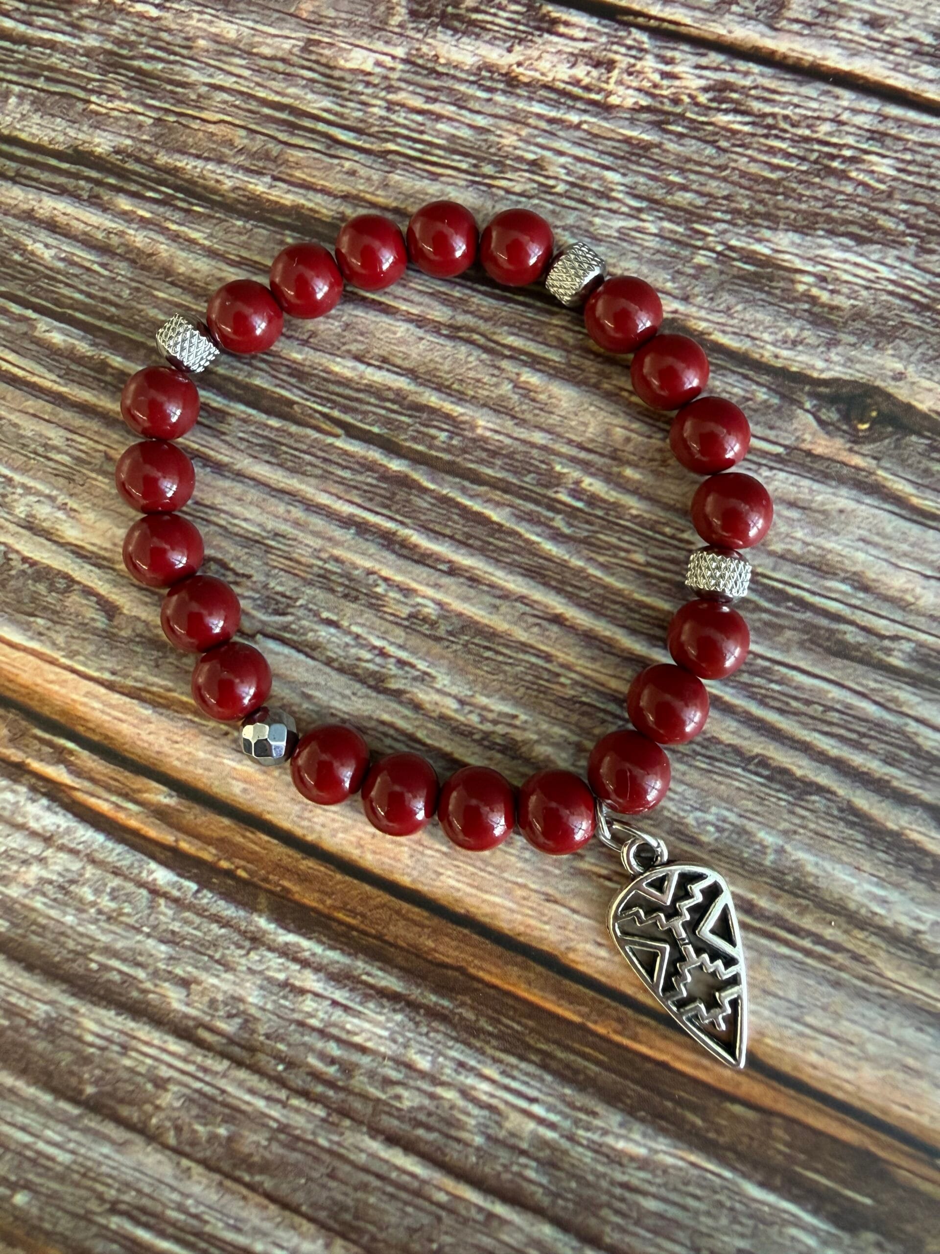 צמיד גומי עשוי אבני חן באדום וחרוזי סטיינלסטיל כסופים עם תליון חץ כסוף.