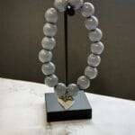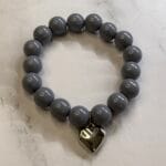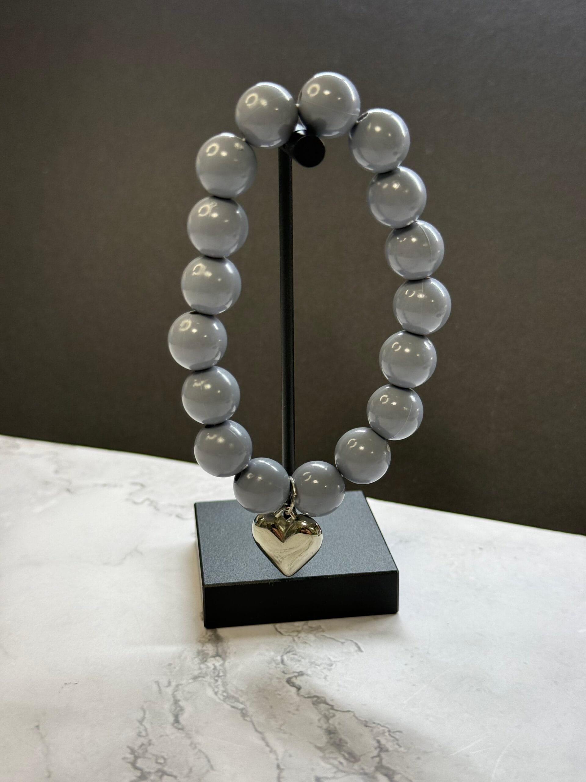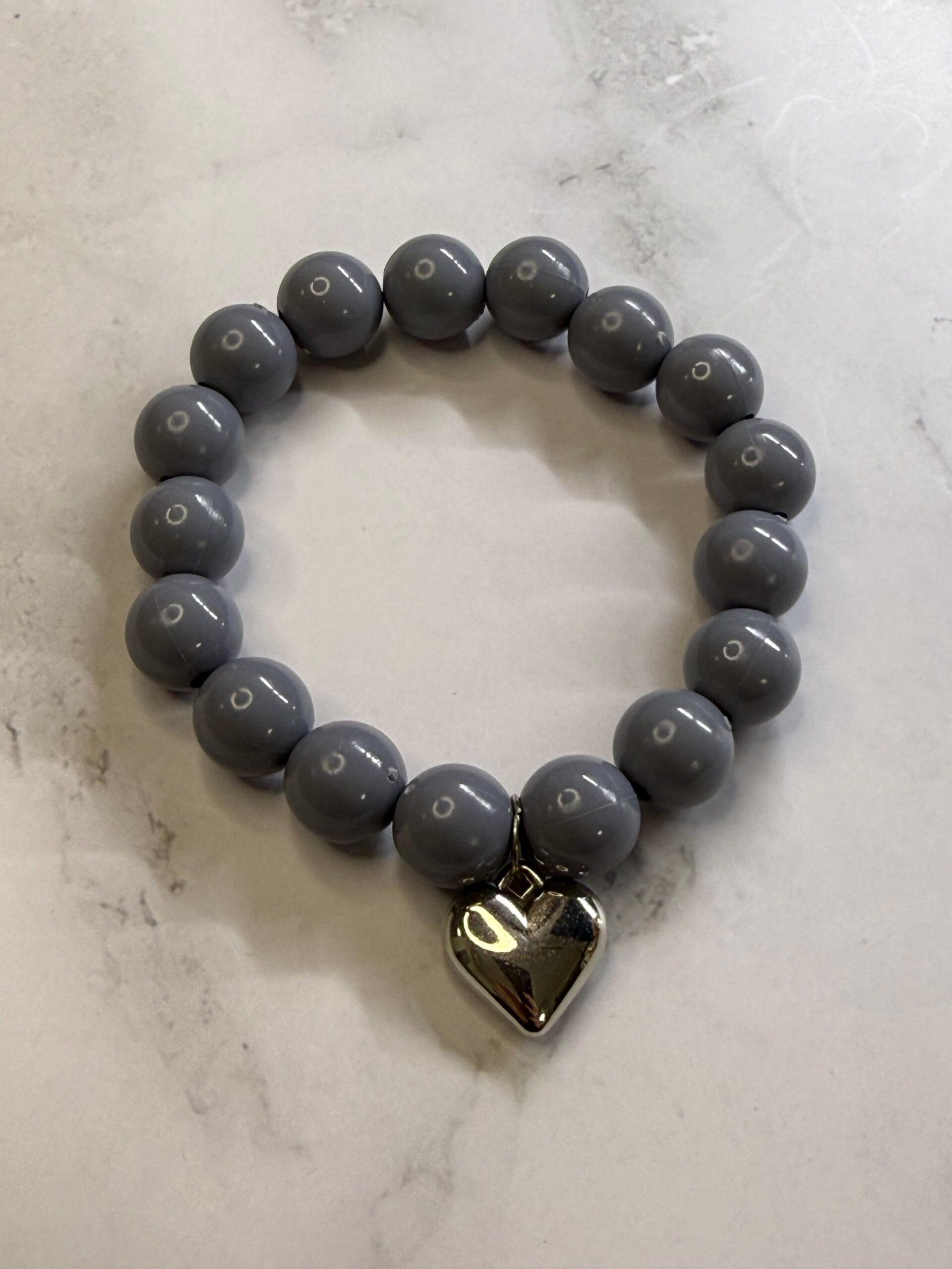 צמיד עשוי גומי גמיש ונמתח עם חרוזי אקריל באפור עם תליון לב כסוף.