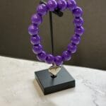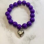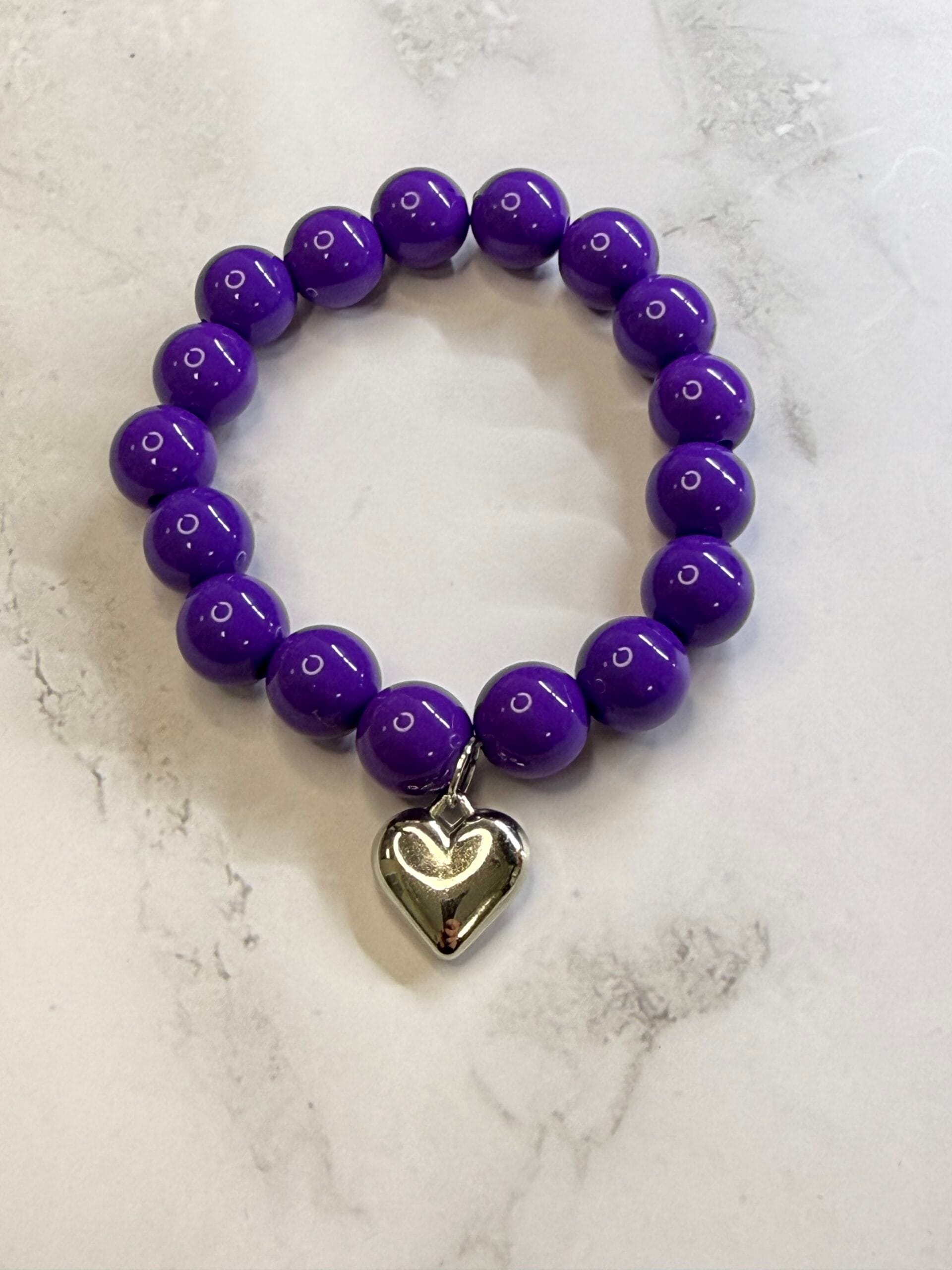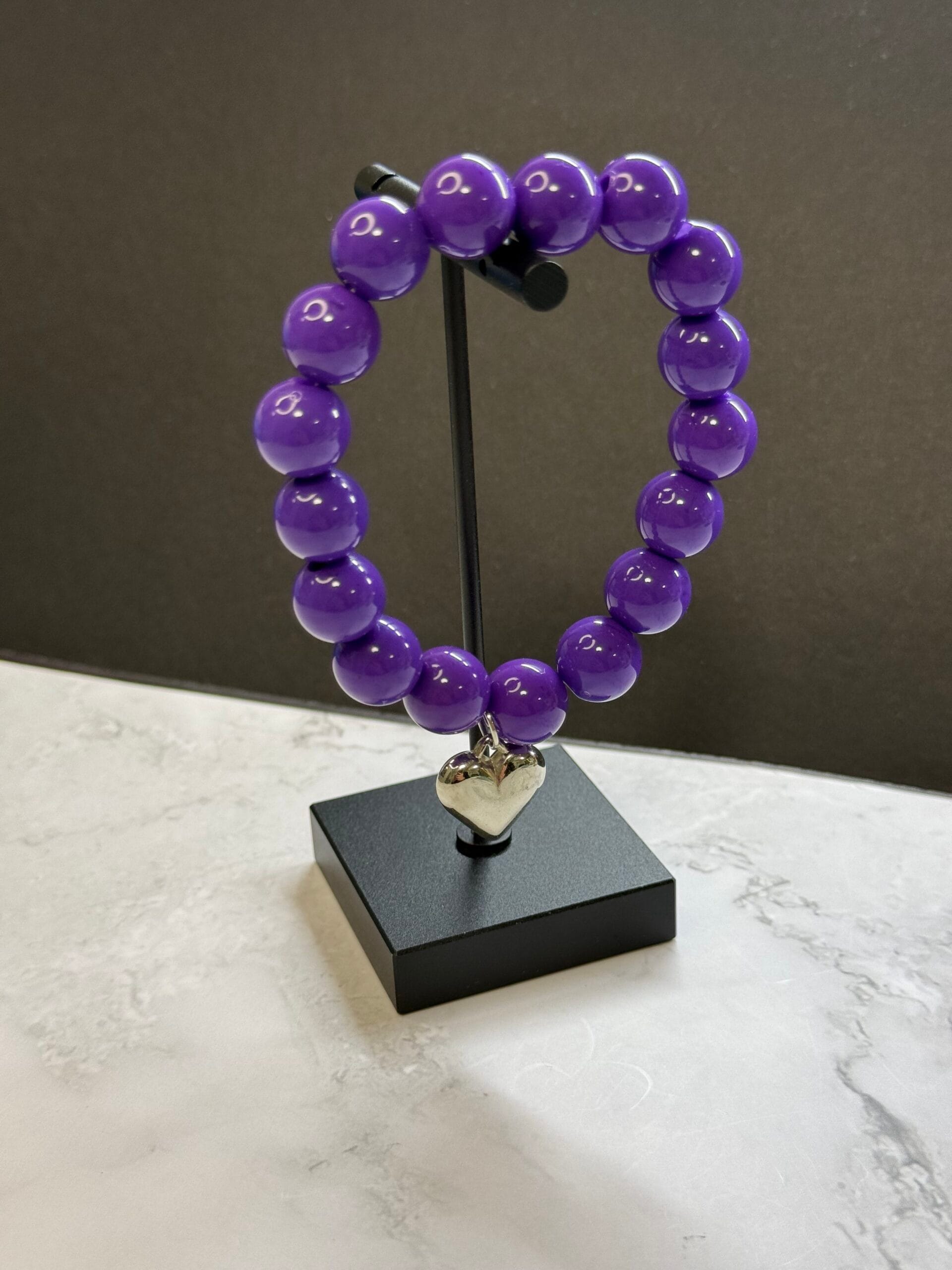 צמיד עשוי גומי גמיש ונמתח עם חרוזי אקריל בסגול עם תליון לב כסוף.