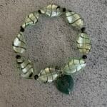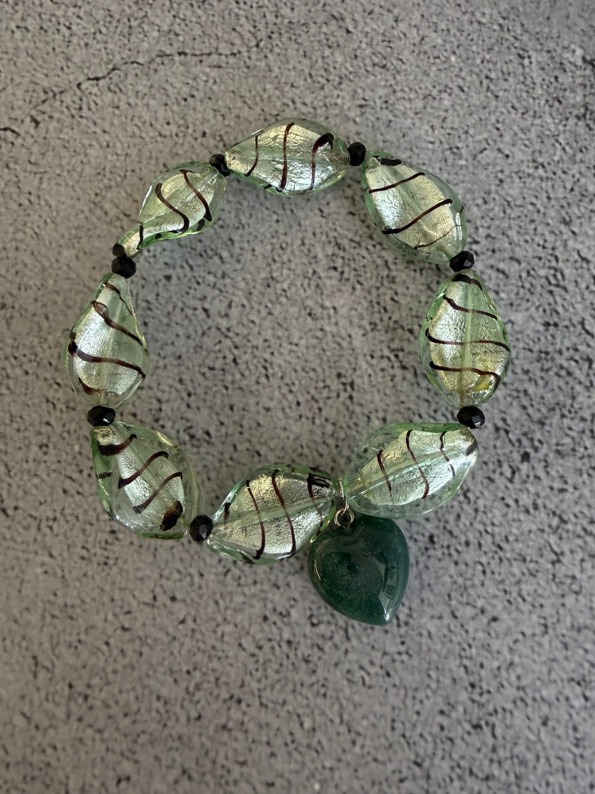 צמיד גומי עשוי חרוזי זכוכית מעוטרים בגוון ירוק ושחור עם תליון לב אבן חן.