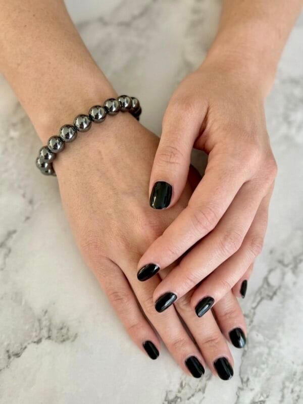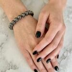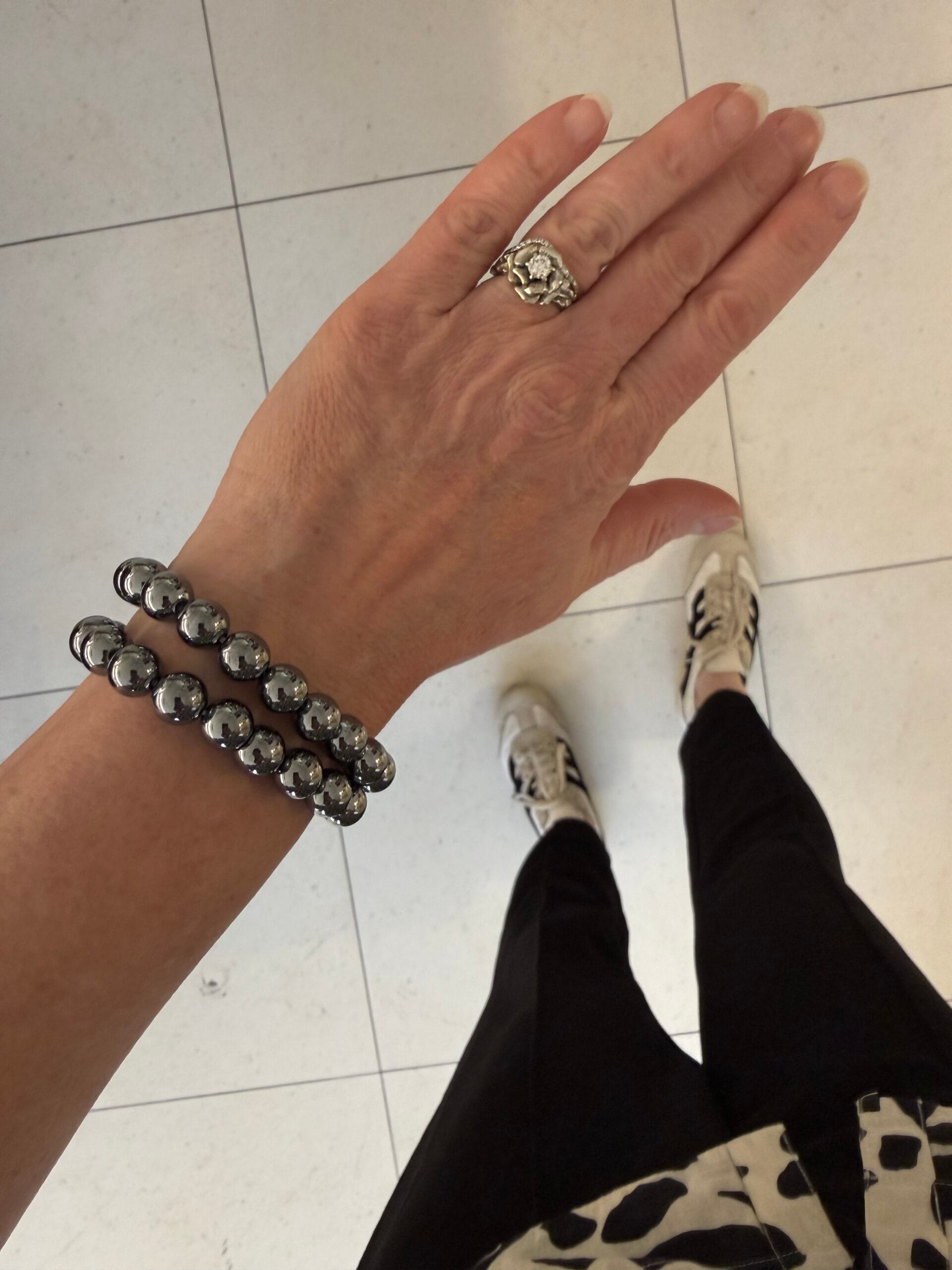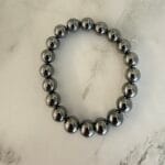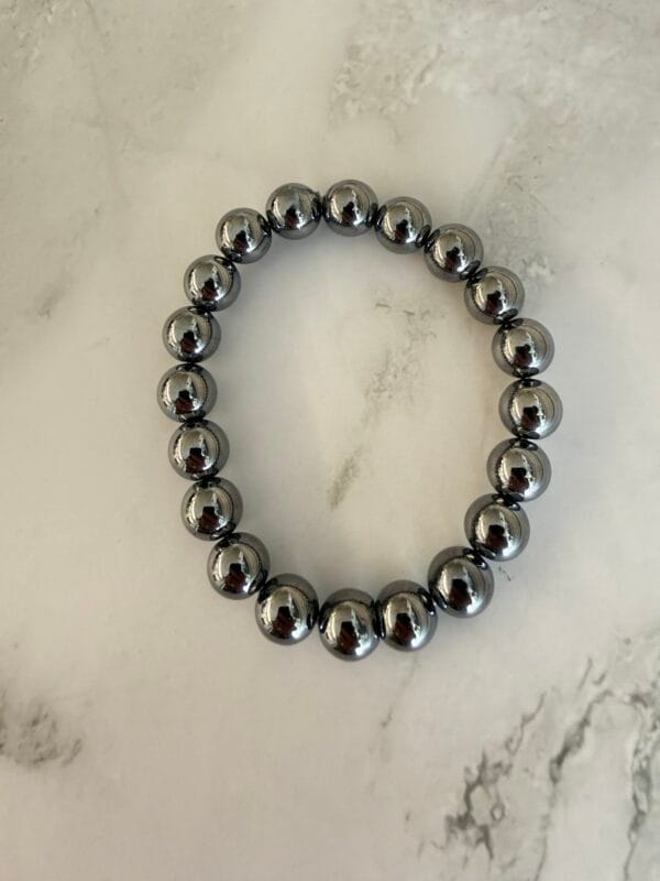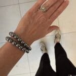 צמיד יוניסקס גומי נמתח וגמיש עם חרוזי המטייט כסוף מטאלי, הצמיד נוכח בסטייל אדג’י ויתאים עם צמידי מתכת נוספים על אותה יד.