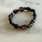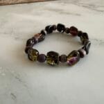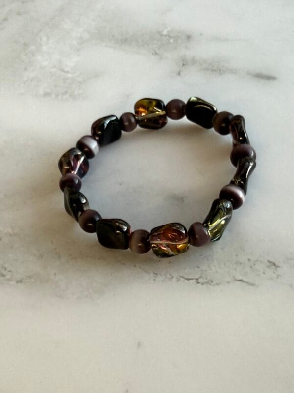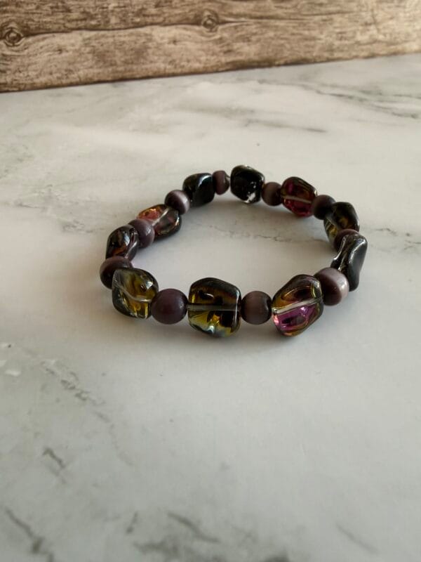 צמיד עשוי גומי גמיש ונמתח עם חרוזי זכוכית שטוחים בגימור מבריק בגוון סגול וורוד שילוב צבעים הרמוני.