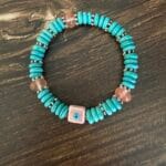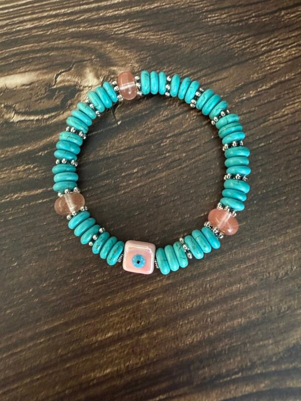 צמיד גומי עשוי חרוזי טורקיז שטוחים וחרוזי רוז קוורץ בשילוב חרוז מרכזי קרמי עם עיטור עין שומרת.