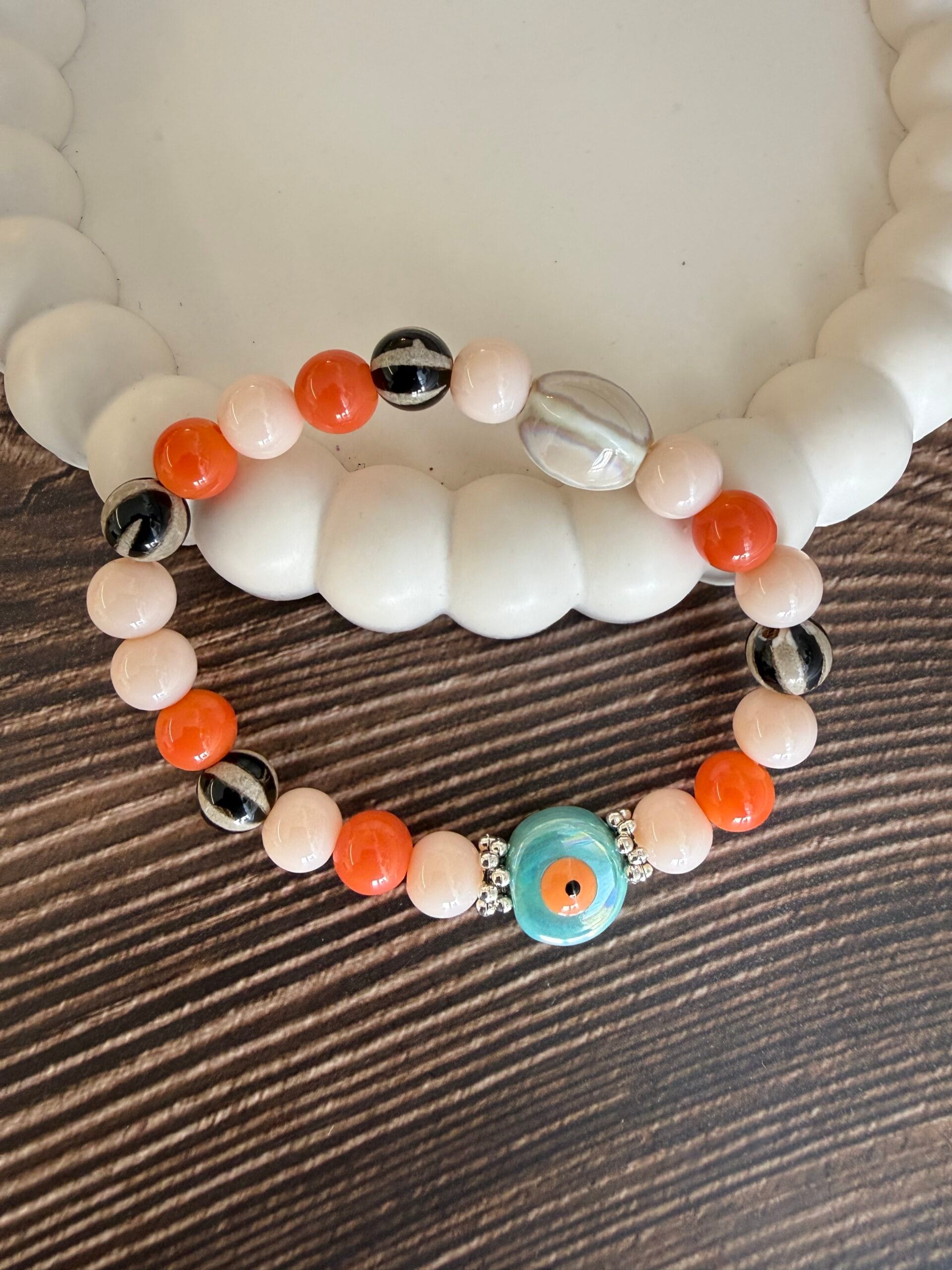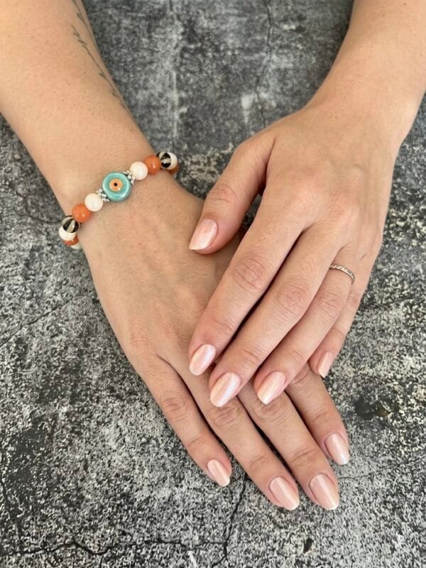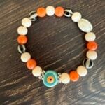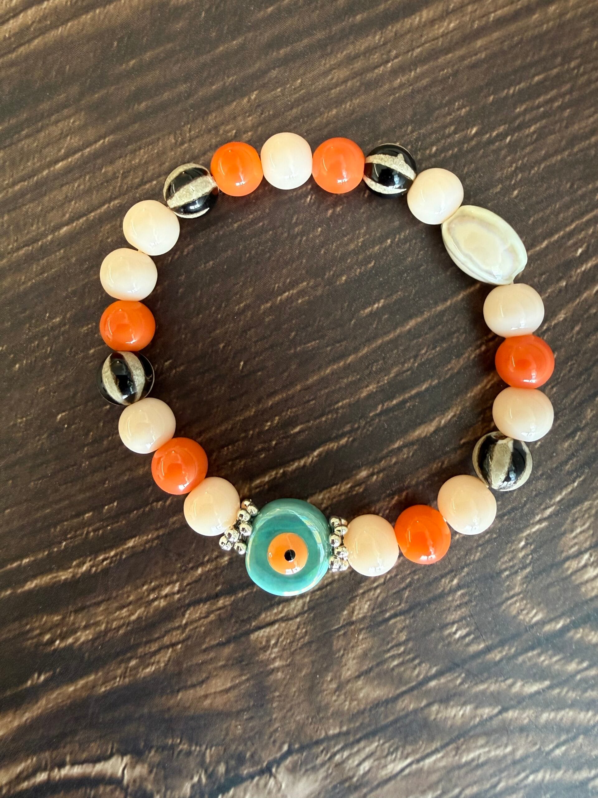 צמיד עשוי גומי גמיש ונמתח עם חרוזי זכוכית וקרמיקה בגווני כתום, שמנת, שחור לבן וחרוז מרכזי עין בטורקיז. שילוב צבעים שמח וססגוני.