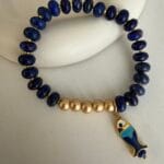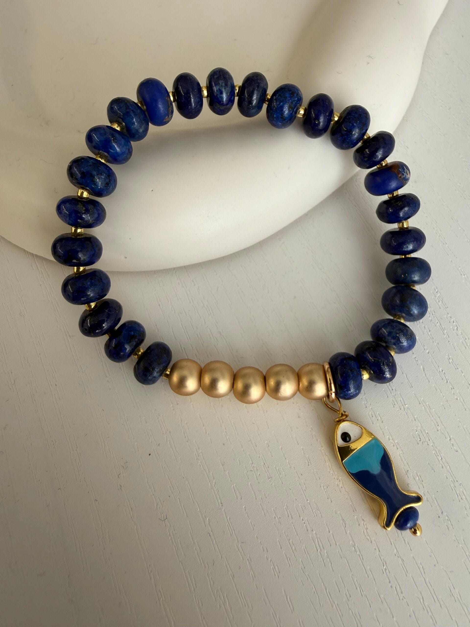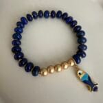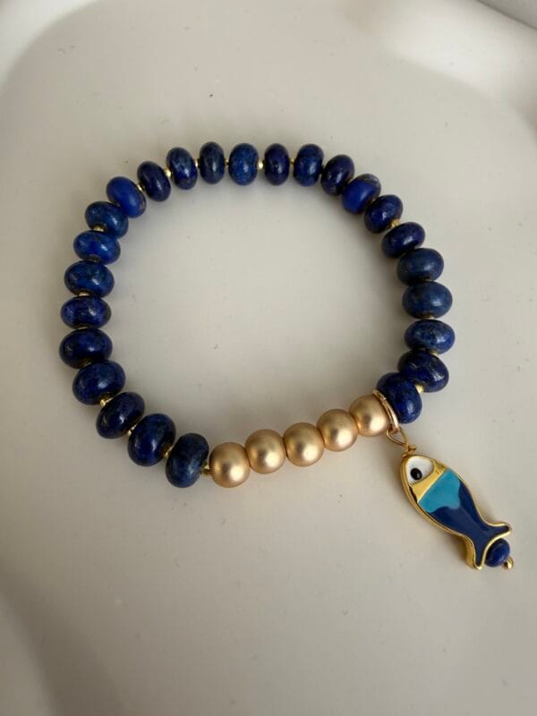צמיד גמיש שקל לענוד עשוי חרוזים בגוון כחול עמוק אבני חן לזולי לאפיס, אבני המטייט ותליון דג אוריינטלי .