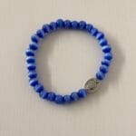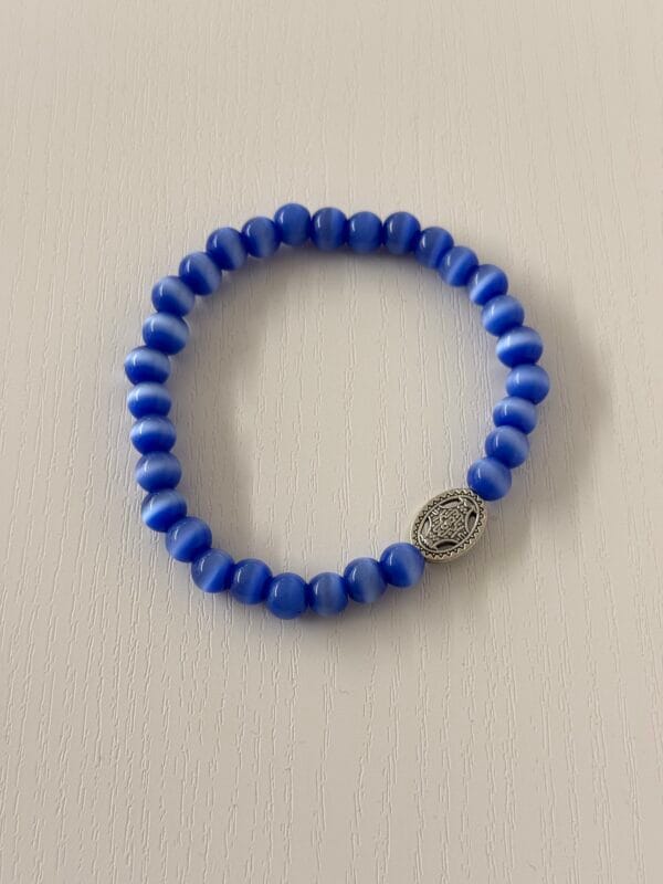 צמיד עשוי גומי גמיש ונמתח עם חרוזי עין החתול כחול עז ומיוחד עם אלמנט כסוף אוריינטלי במרכז.