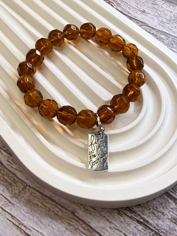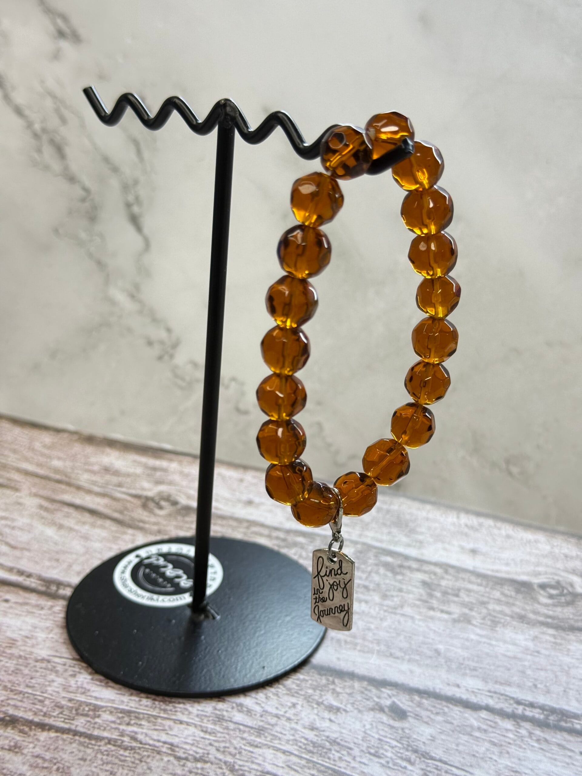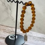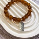 צמיד עשוי גומי גמיש ונמתח עם חרוזי קריסטל בגוון חום דבש חצי שקופים עם תליון השראה כסוף, שניתן להסיר בקלות .