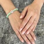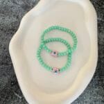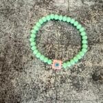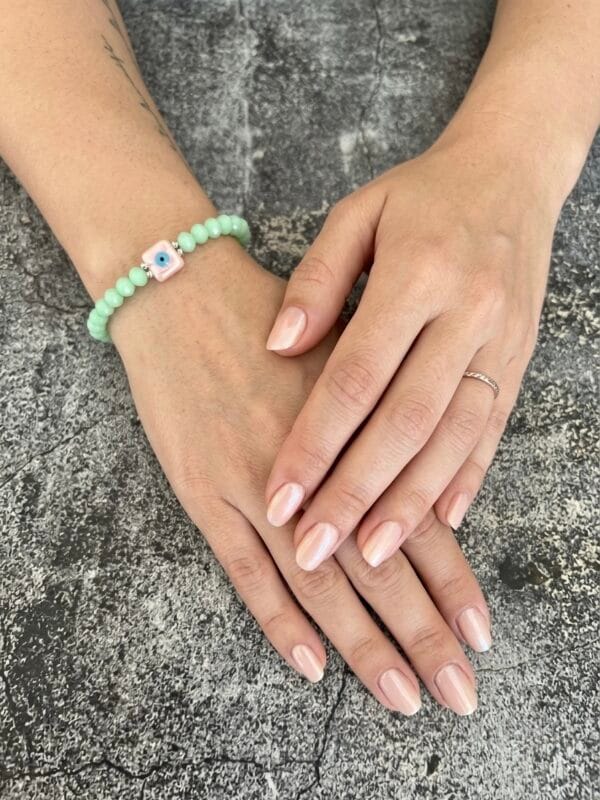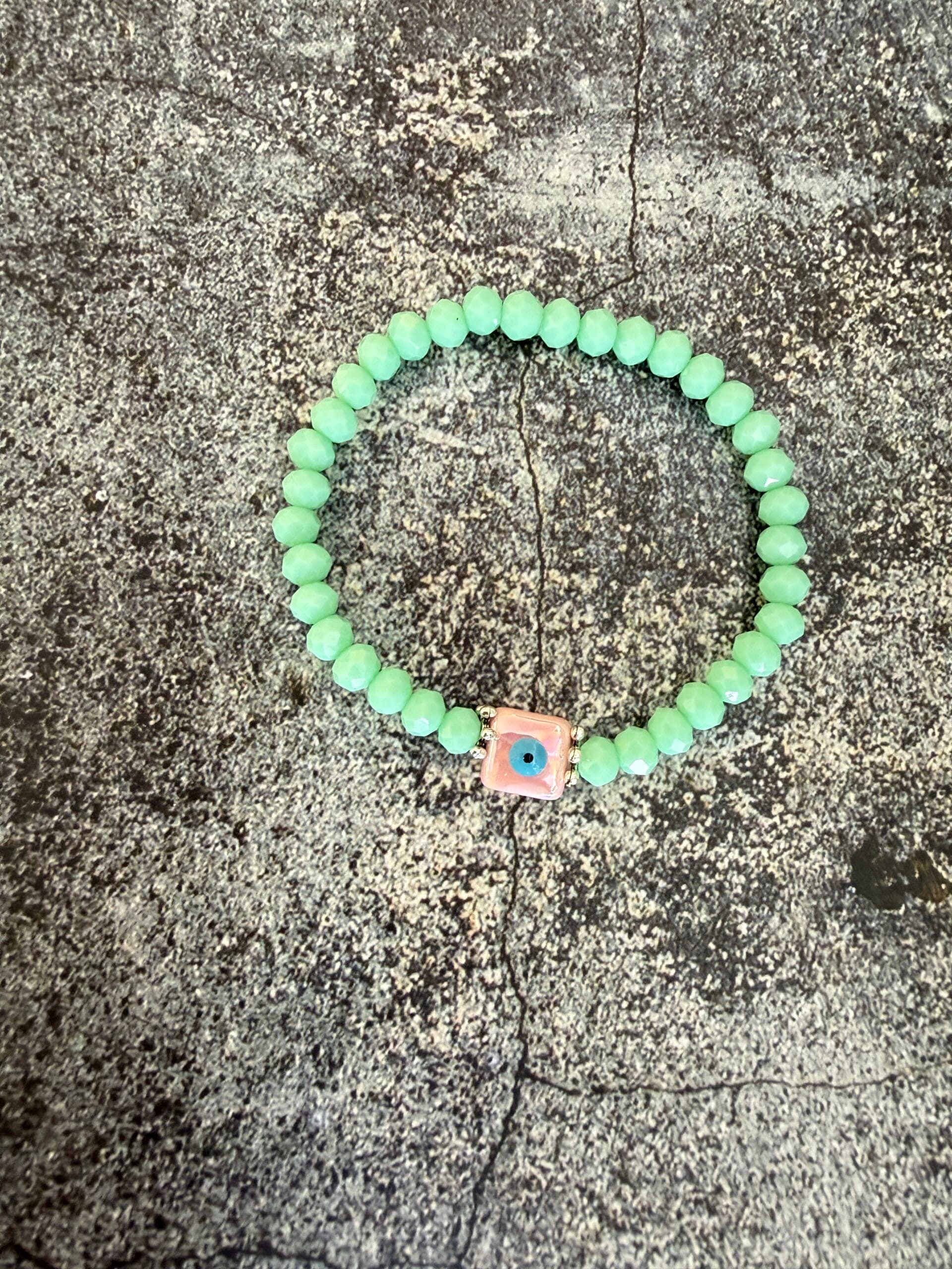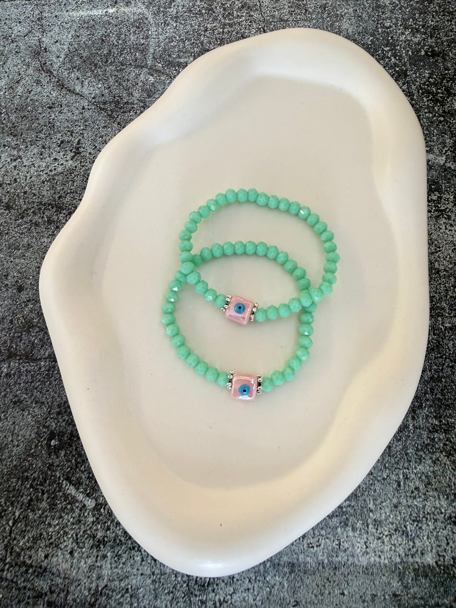 צמיד עשוי גומי גמיש ונמתח עם חרוזי קריסטל בגוון ירוק ואבן קרמיקה ֿורודה עם עין. שילוב צבעים עדין ורגוע.