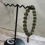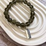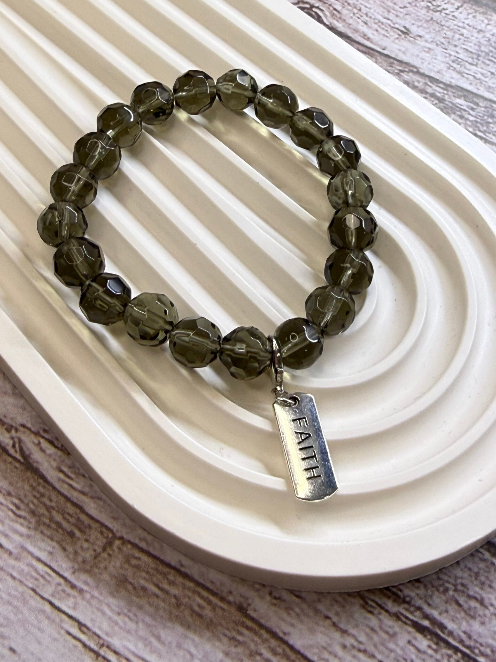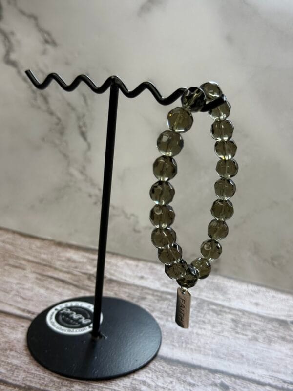 צמיד עשוי גומי גמיש ונמתח עם חרוזי קריסטל בגוון שחור מעושן חצי שקופים עם תליון השראה כסוף, שניתן להסיר בקלות .