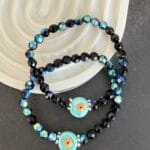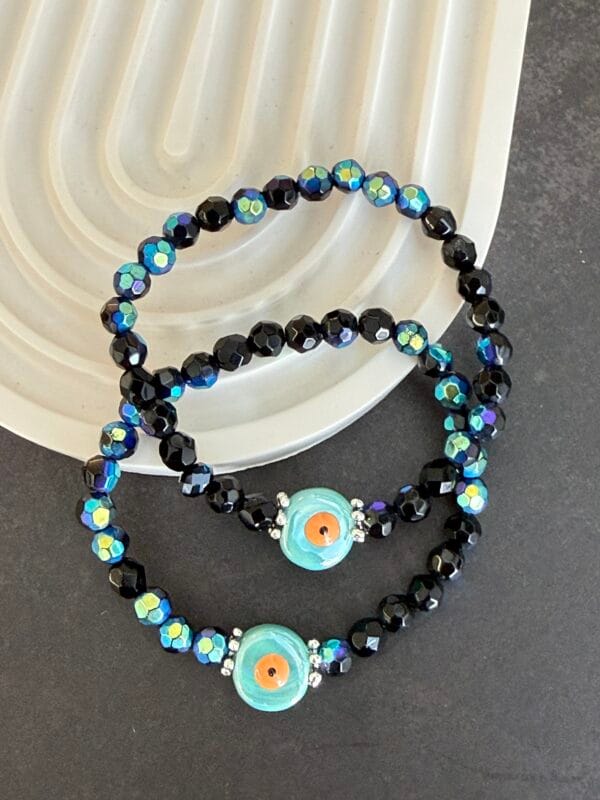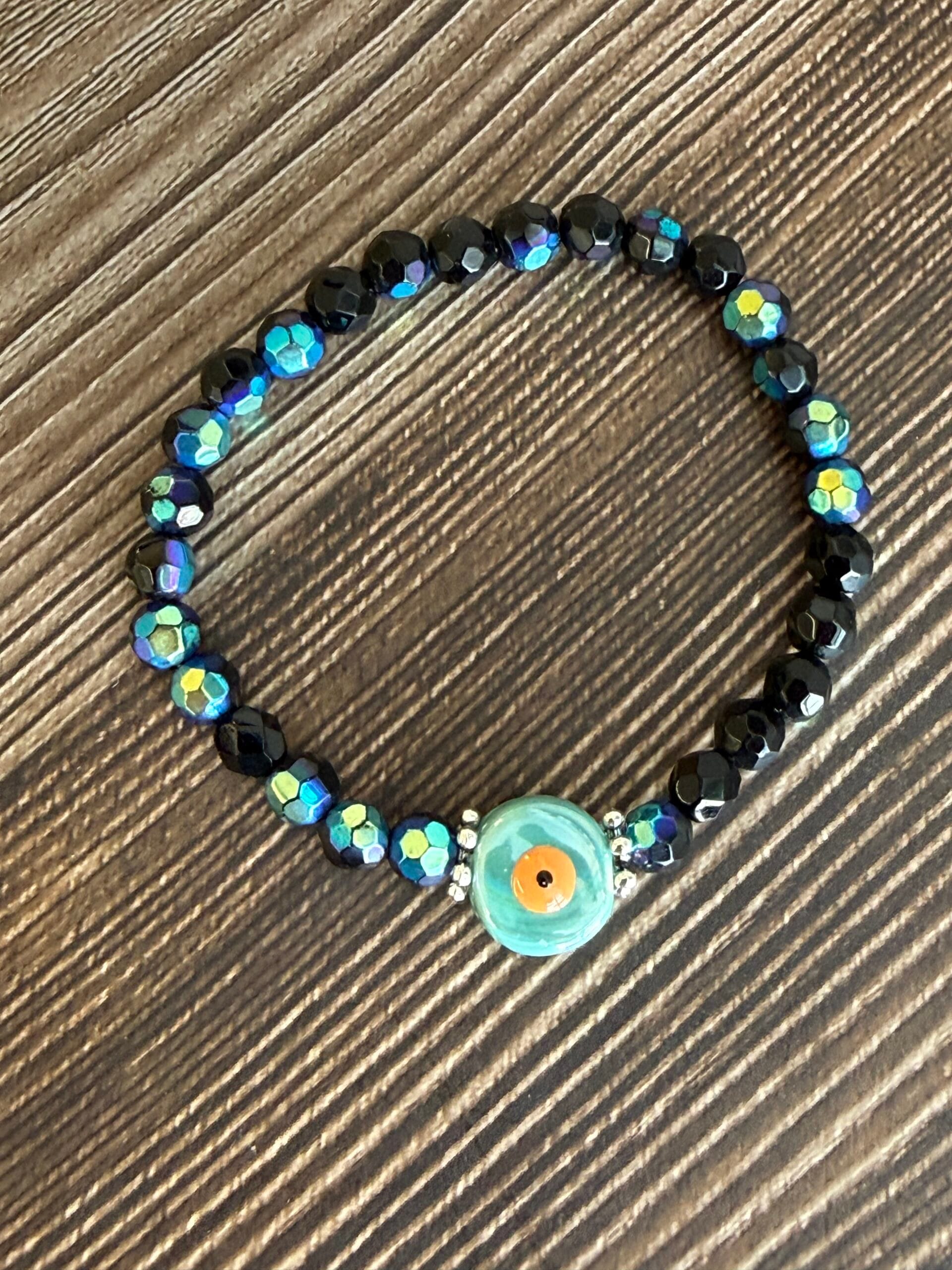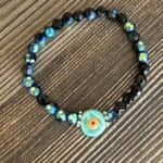 צמיד עשוי גומי גמיש ונמתח עם חרוזי קריסטל שחורים ואבן קרמיקה ֿבגוון טורקיז עם עין. שילוב צבעים משמח ורענן.