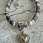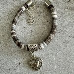 צמיד עשוי חבל כותנה נעים למגע בגוונים חום ואפור שזור בחוטי זהב עם אלמנט כסוף מרכזי ועליו תליון לב תחרה.