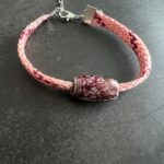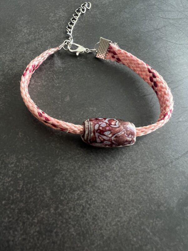 צמיד חבל קלוע בגוון ורוד עם נגיעות באדום בשילוב חרוז קרמיקה בגוון בורדו