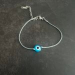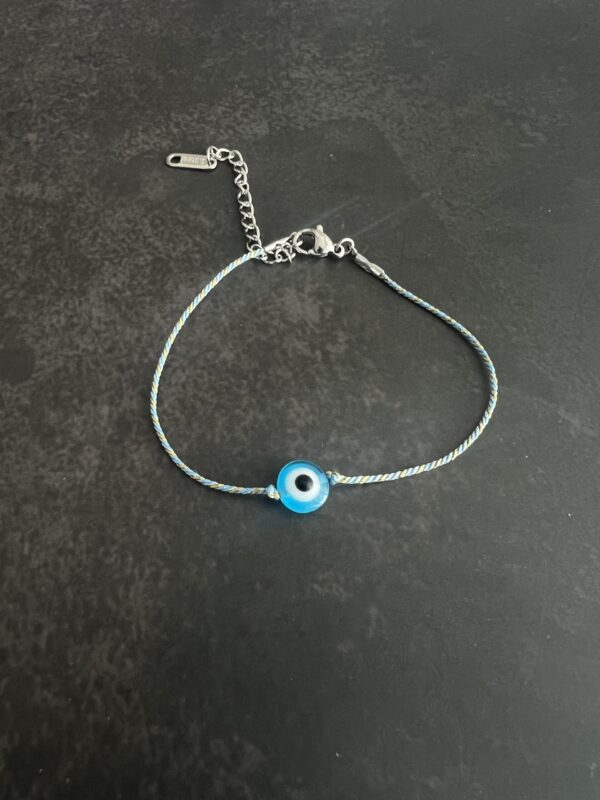 צמיד חוט משי  בגוון תכלת עם חוט זהב שזור , עדין ומיוחד עם חרוז עין .