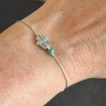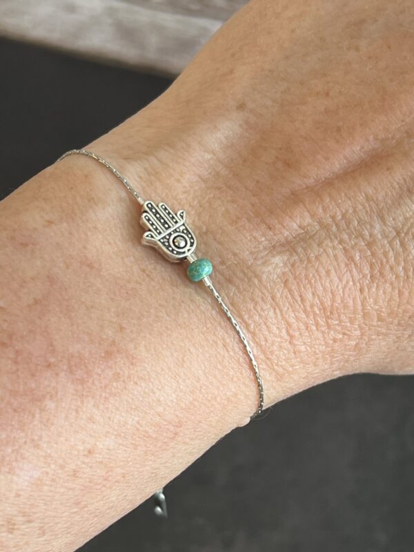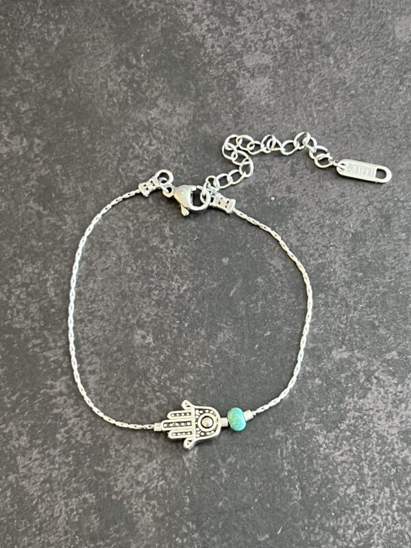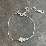 צמיד חוליות עדין ודק עם חרוז חמסה מעוטר כסוף וחרוז ג'אספר טורקיז.