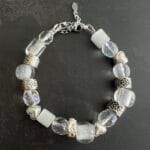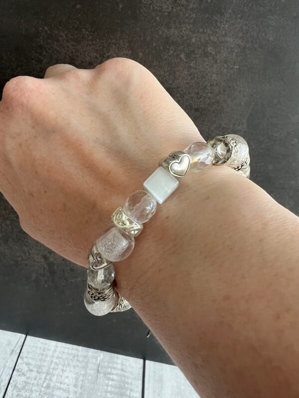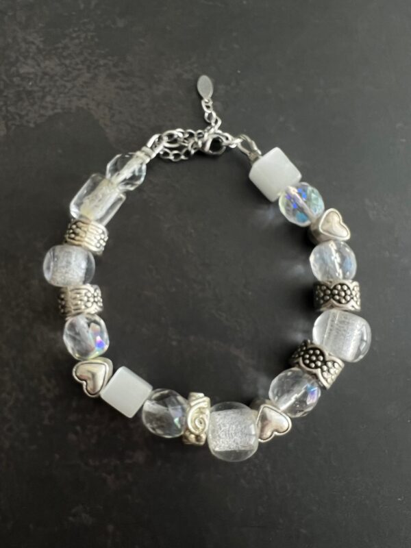 צמיד חרוזי זכוכית וחרוזי לבבות מתכת .