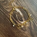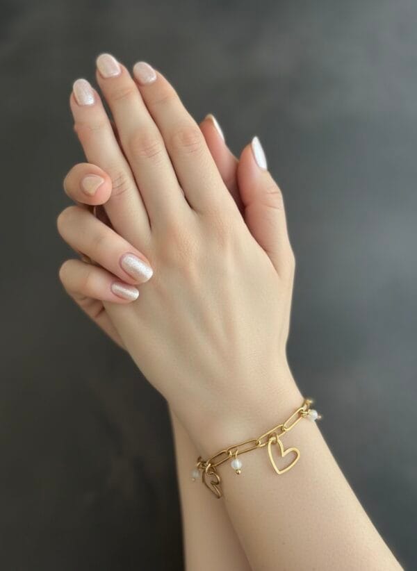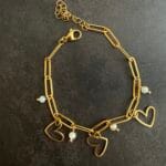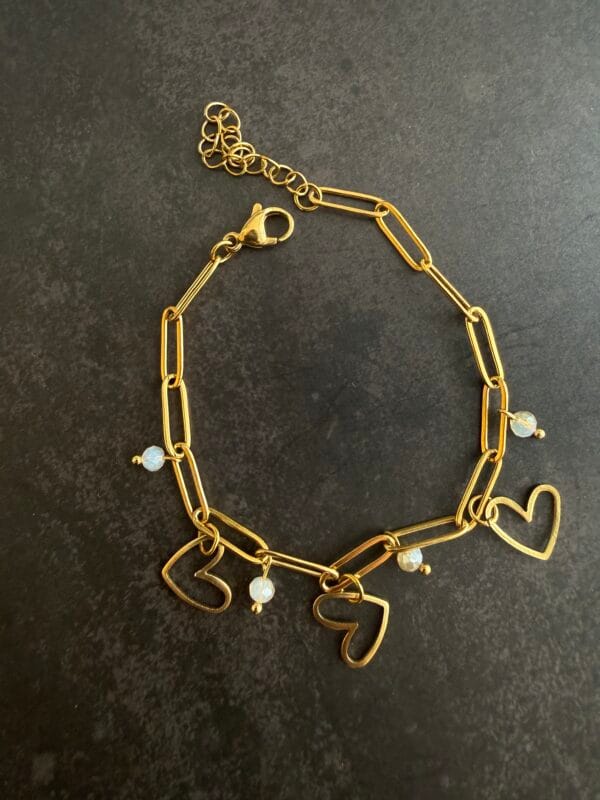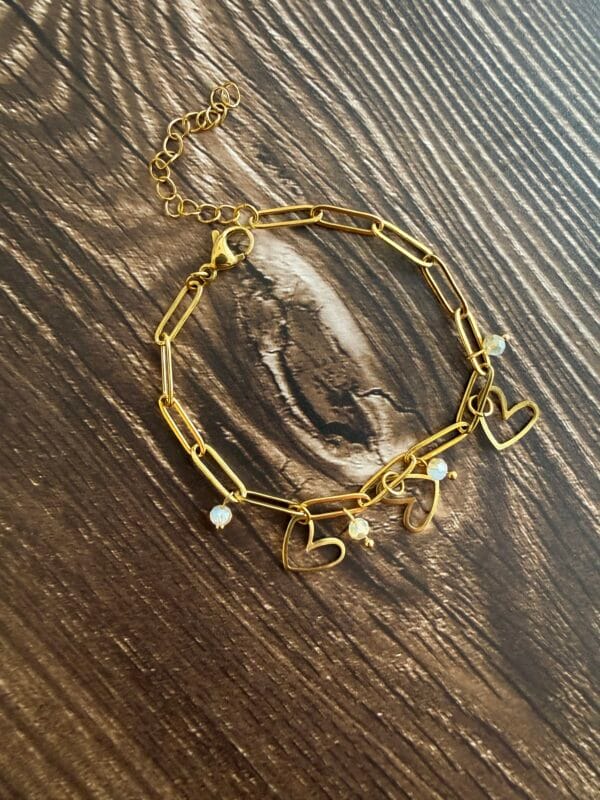 צמיד לולאות סטיינלסטיל בציפוי זהב איכותי עם צ׳ארמס לבבות מוזהבים וחרוזי זכוכית .