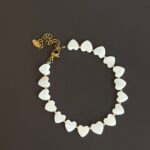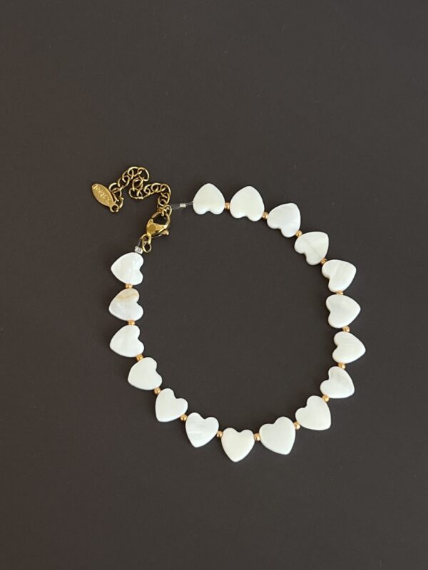 צמיד עשוי חרוזי צדף בצורת לב עם חרוזים קטנטנים מוזהבים.