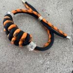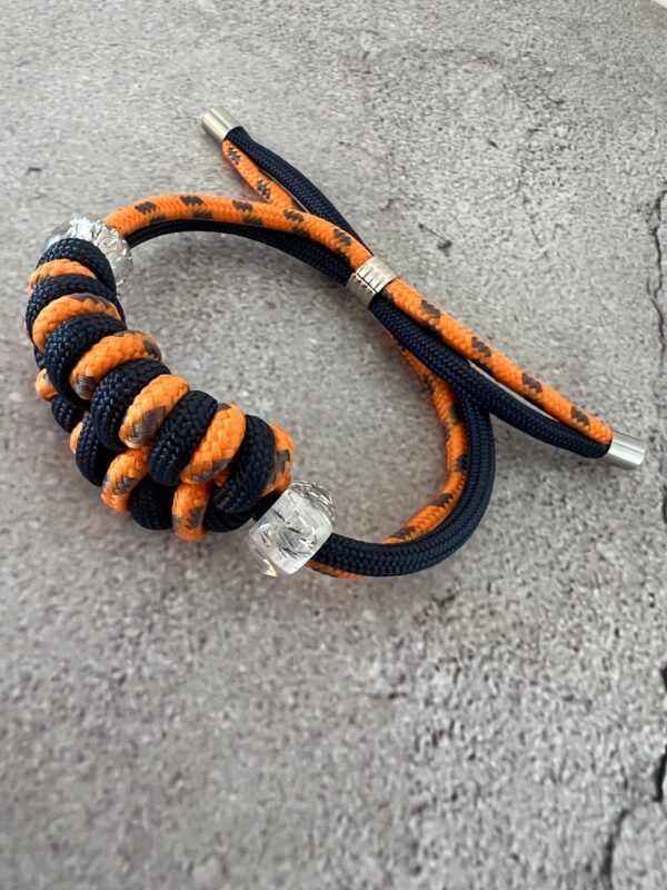 צמיד מקרמה עשוי חבל כתום וכחול בשילוב חרוזים שקופים.
