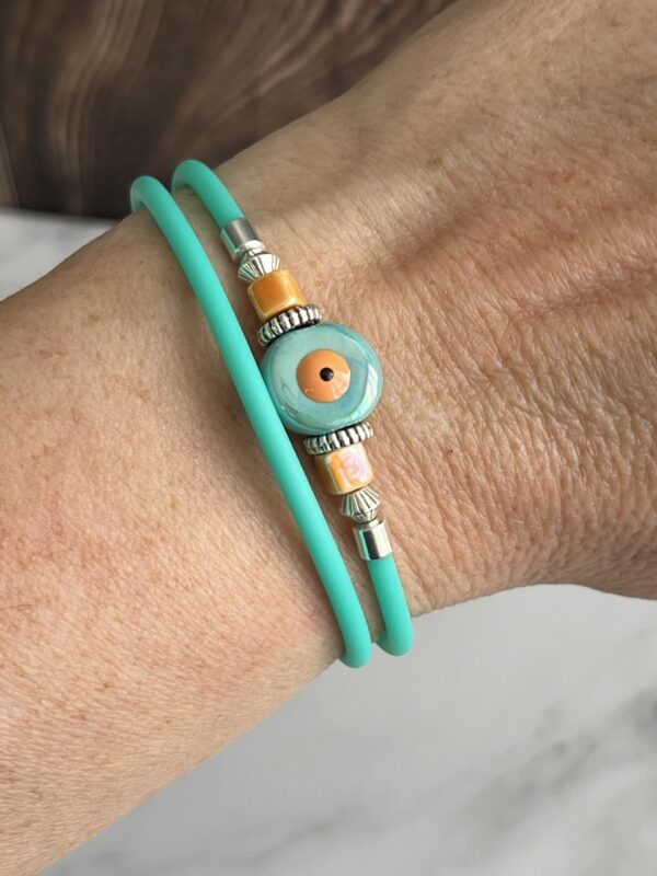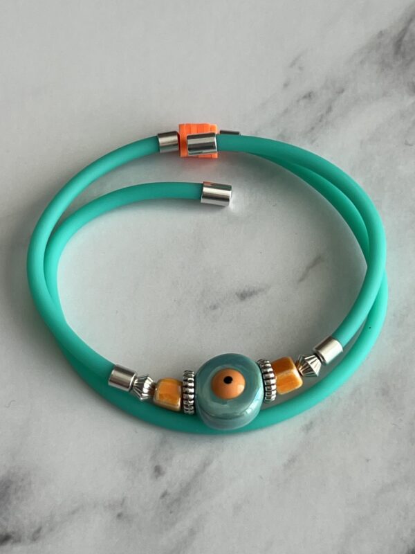 הוסיפו נגיעה של סטייל והגנה עם צמיד הסיליקון הצבעוני, המעוצב עם חרוזי “עין” מיוחדים ואלמנטים מתכתיים נוצצים. כל צמיד עשוי מסיליקון גמיש ונעים למגע, משולב בגוונים עזים ובחרוזי קרמיקה בעבודת יד ליצירת מראה ייחודי ומושך.