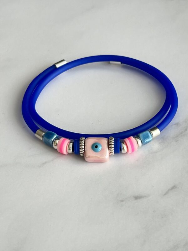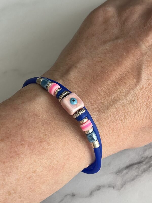 הוסיפו נגיעה של סטייל והגנה עם צמיד הסיליקון הצבעוני, המעוצב עם חרוזי “עין” מיוחדים ואלמנטים מתכתיים נוצצים. כל צמיד עשוי מסיליקון גמיש ונעים למגע, משולב בגוונים עזים ובחרוזי קרמיקה בעבודת יד ליצירת מראה ייחודי ומושך.