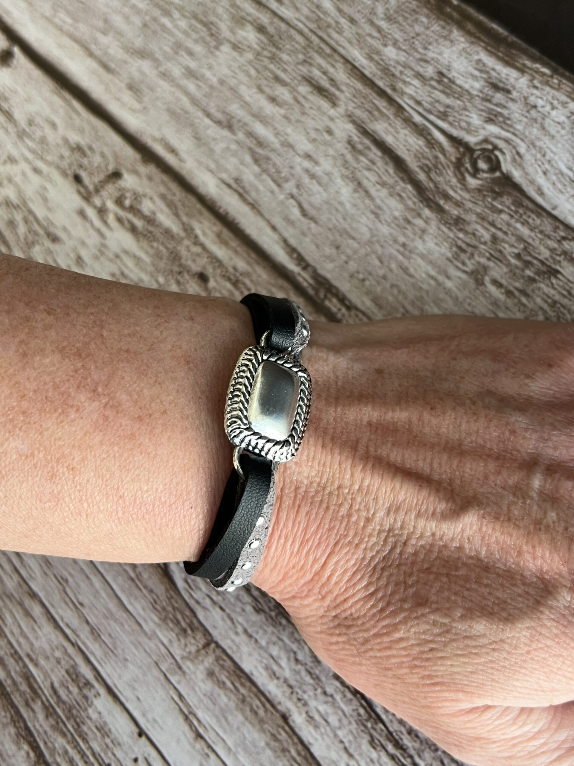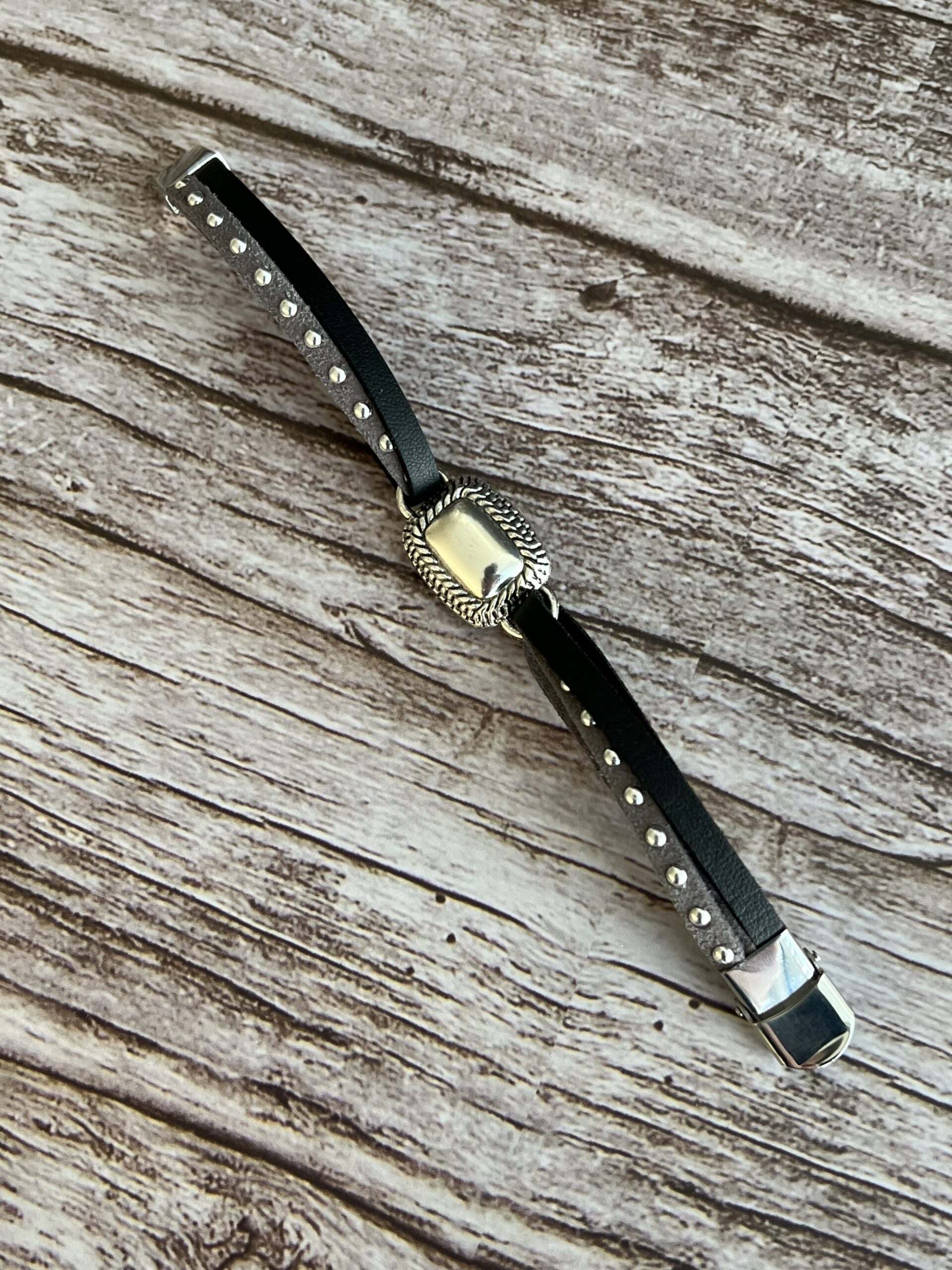 הצמיד עשוי עור איכותי בצבע אפור ושחור, משובץ ניטים כסופים לאפקט מודרני וייחודי, ומרכזו מעוטר באלמנט מתכתי מרשים בעל מסגרת טקסטורה עדינה.