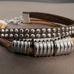 צמיג עור בגווני חום משולב בחרוזי צינור כסופים.
