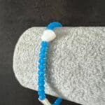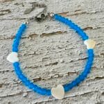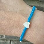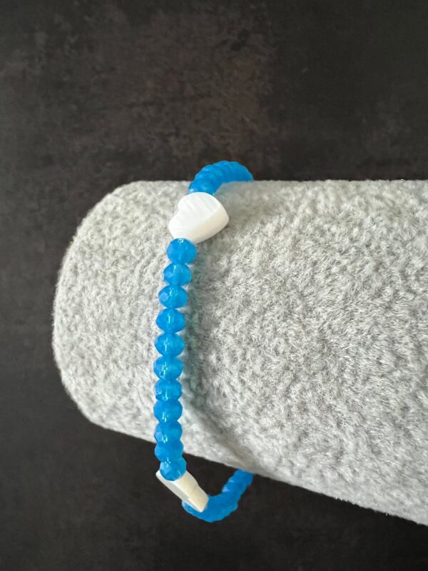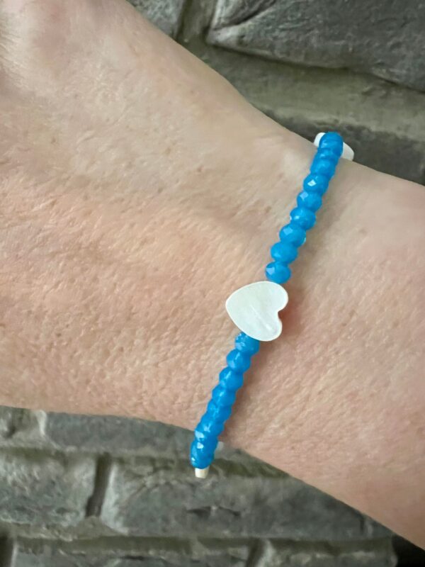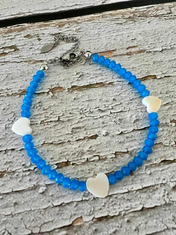 צמיד עשוי חרוזי קריסטל בגוון תכלת בשילוב חרוזי לב צדף פנינה.