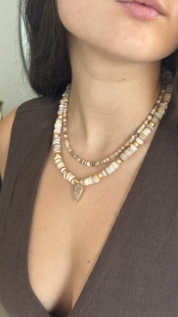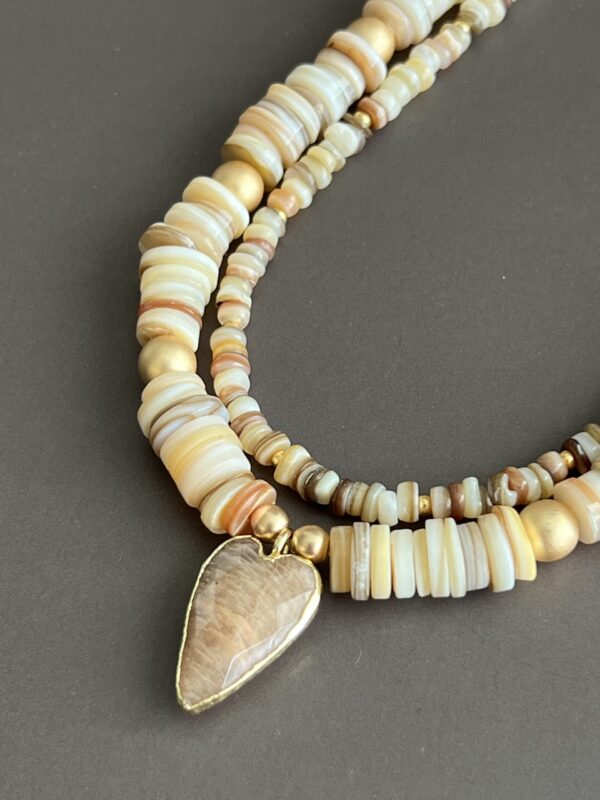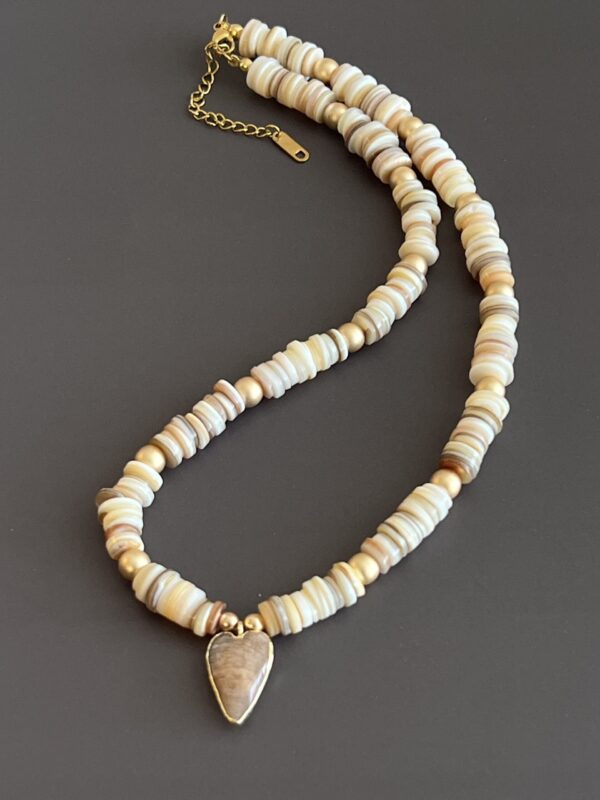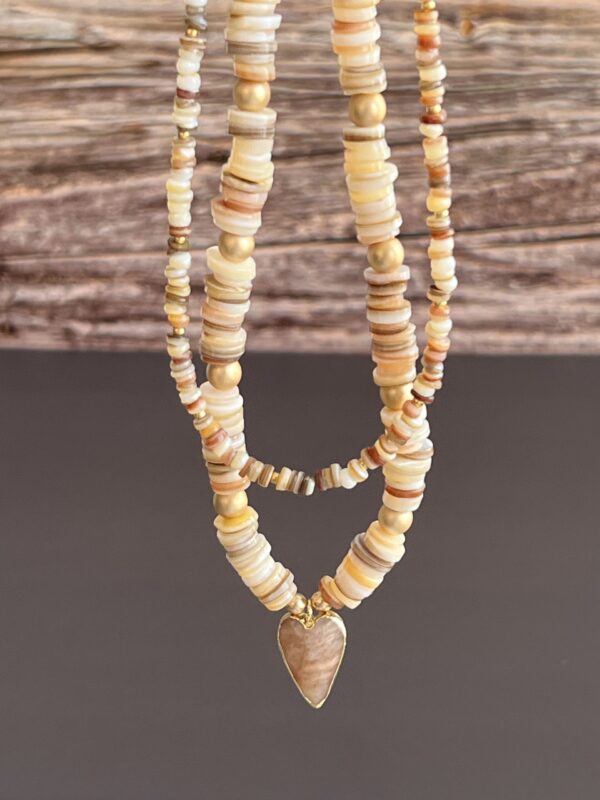 מראה מושלם בלי לחשוב פעמיים כל אחת מהשרשראות יכולה להילבש לבד או בשילוב – למראה קליל ביום, או שכבות מרשימות לערב. אין צורך להתאמץ – זה פשוט עובד. חומרים טבעיים שנבחרו באהבה חרוזי צדף טבעיים בעבודת יד, גוונים הרמוניים שמדברים בשקט אבל נשארים בזיכרון, ותליון לב עשוי מאבן השמש (Sunstone) שמוסיף רוך ונוכחות עם טאץ’ יוקרתי.