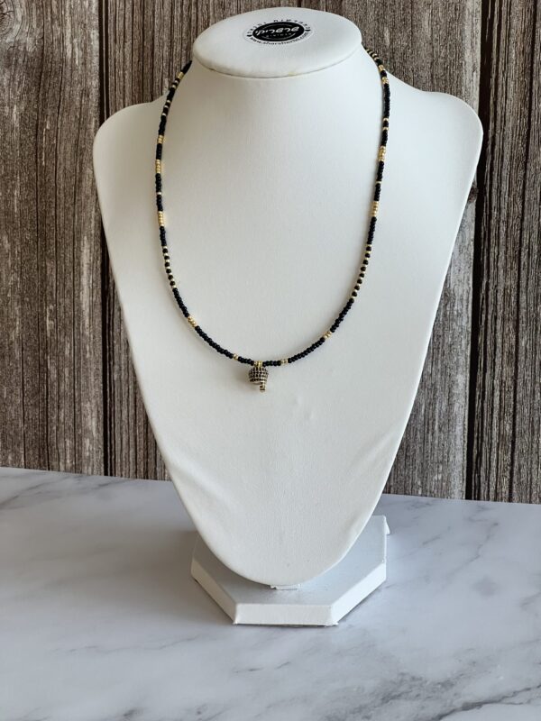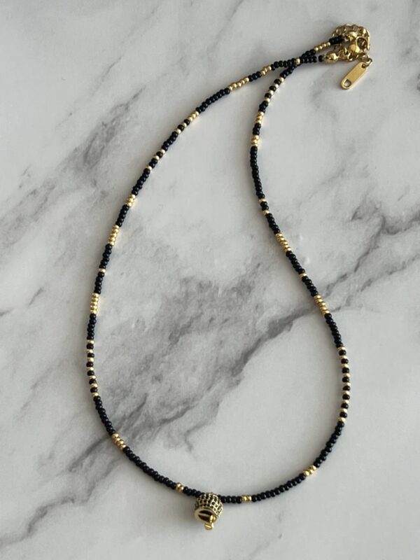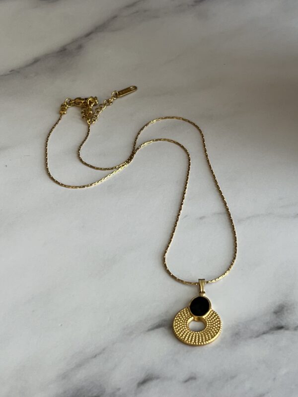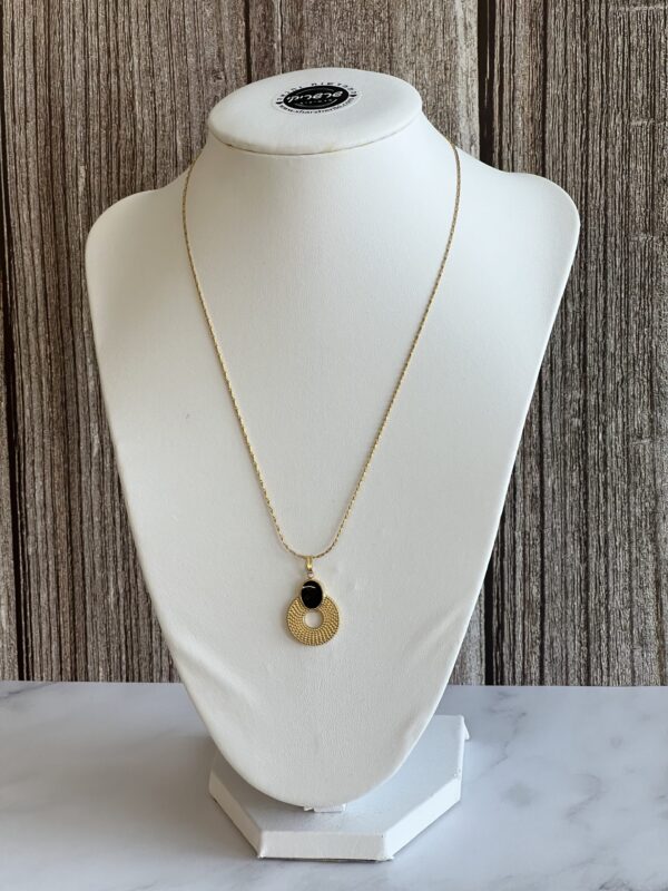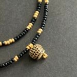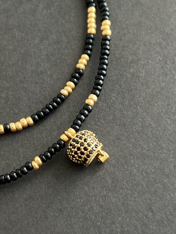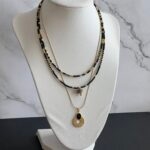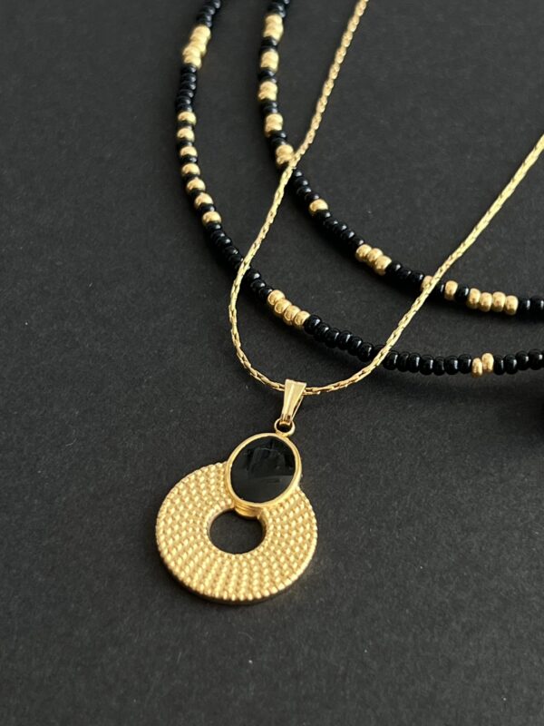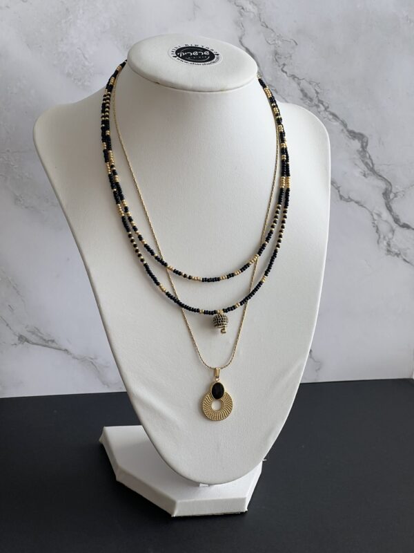 * תליונים בעלי אמירה: כל שרשרת מתהדרת בתליון ייחודי משלה – כדור מעוצב בחרוזים שחורים וזהובים בשרשרת האמצעית, ותליון זהב יוקרתי בעל צורה גיאומטרית אלגנטית עם אלמנט שחור בשרשרת התחתונה. שילוב זה יוצר עניין ויזואלי ומראה מעוצב לפרטי פרטים.