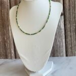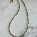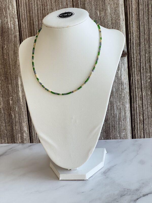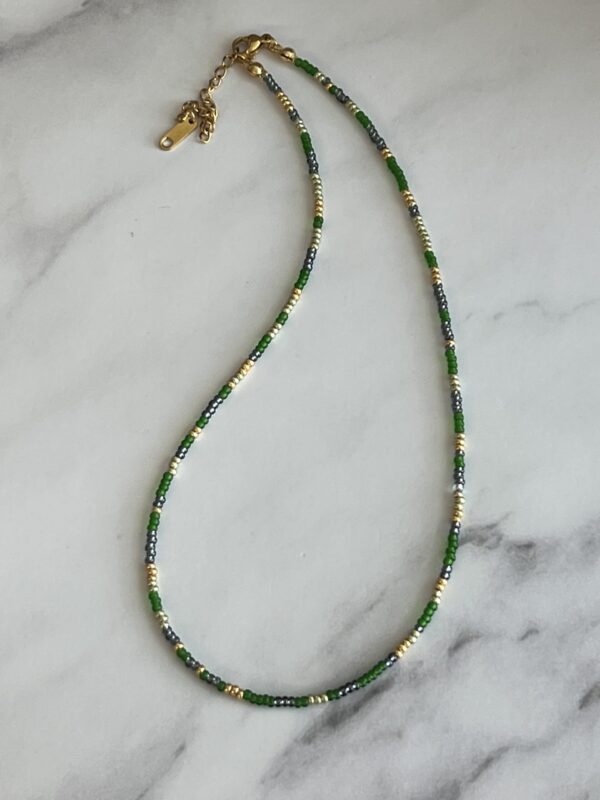 שרשרת חרוזים יפניים בגווני ירוק, זהב ואפור – שילוב טבעי עם נגיעה מטאלית.