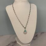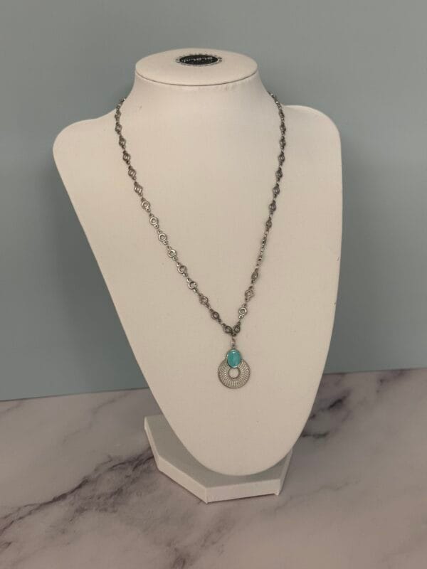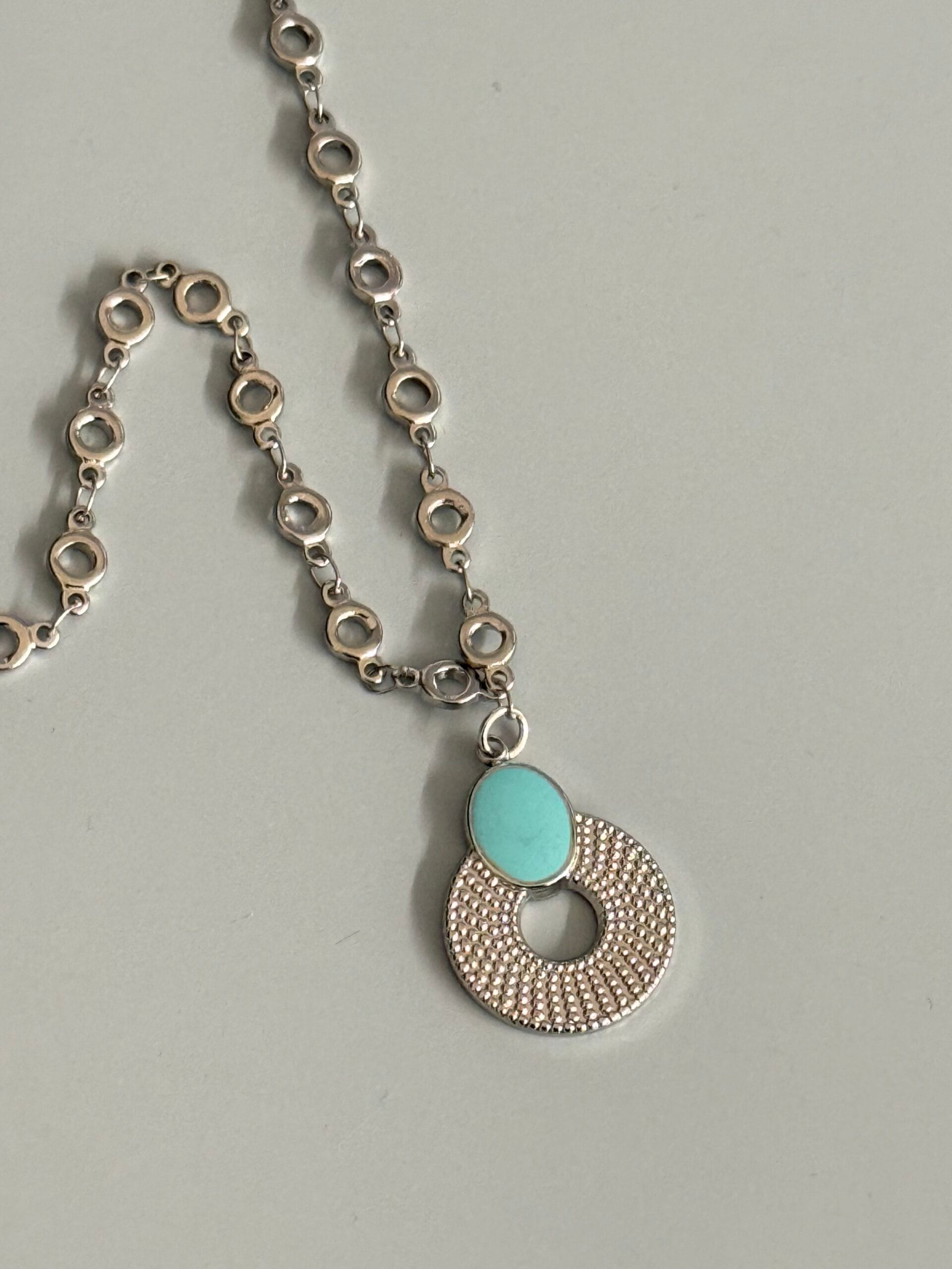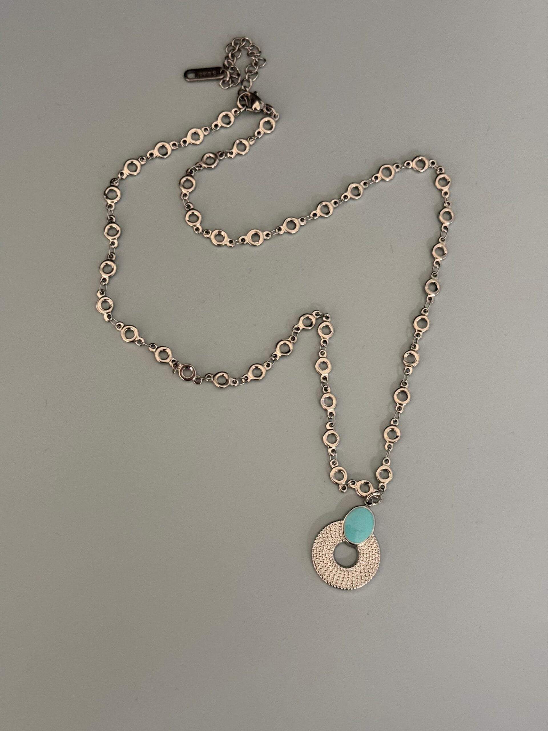 השרשרת עשויה חוליות כסופות אל חלד עם תליון כסוף וקישוט אמייל בגוון תכלת.