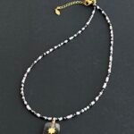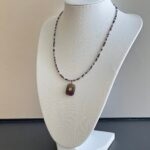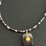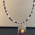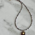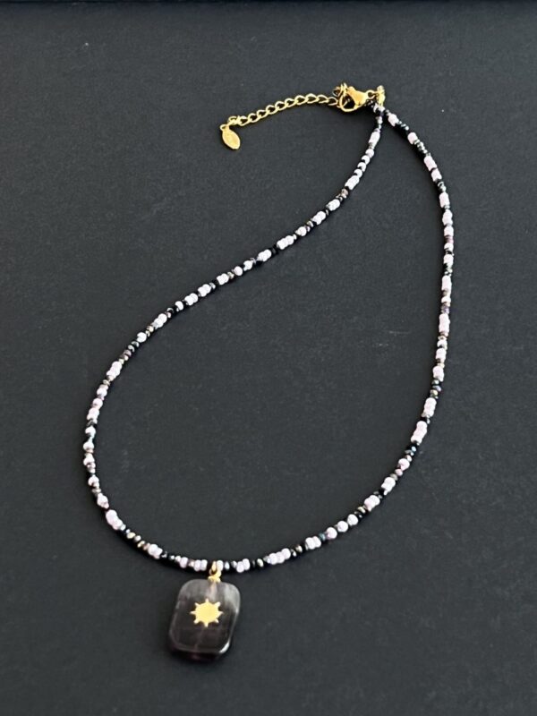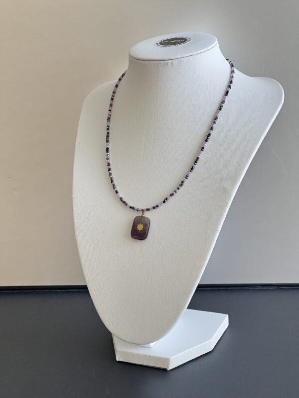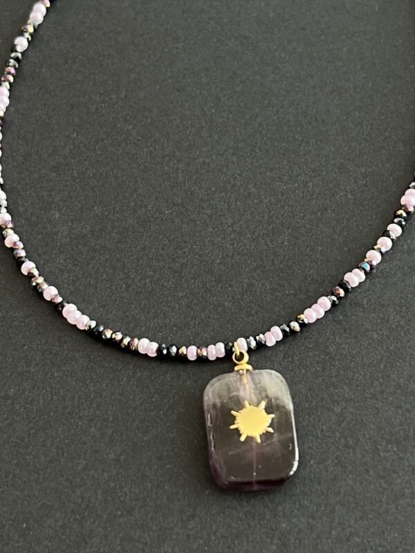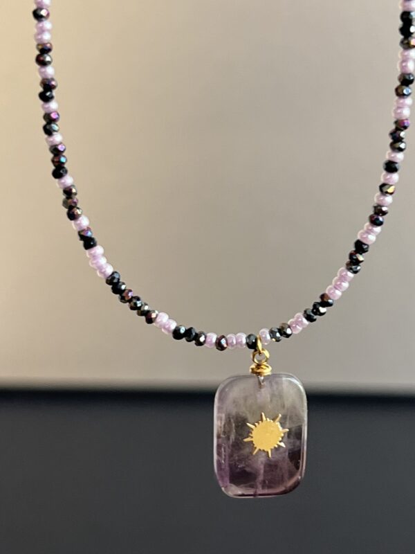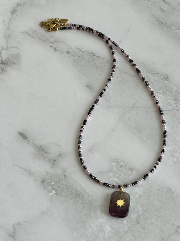 שרשרת גוונים עשויה חרוזים יפניים וחרוזי קריסטל ותליון אמטיסט סגול עם אלמנט מוזהב.