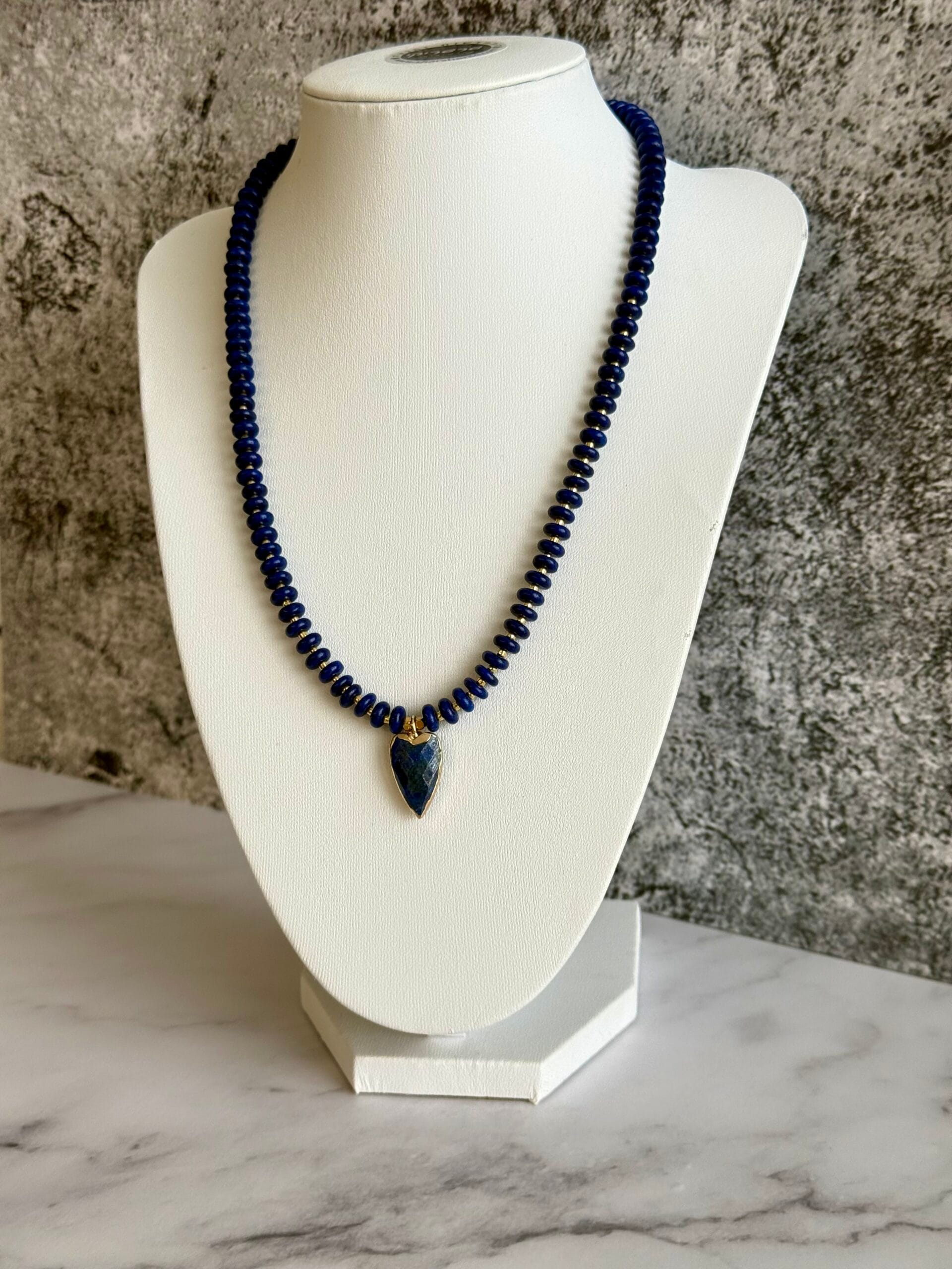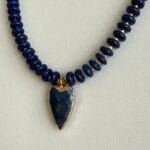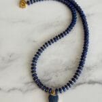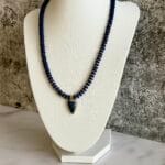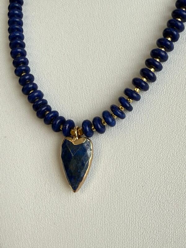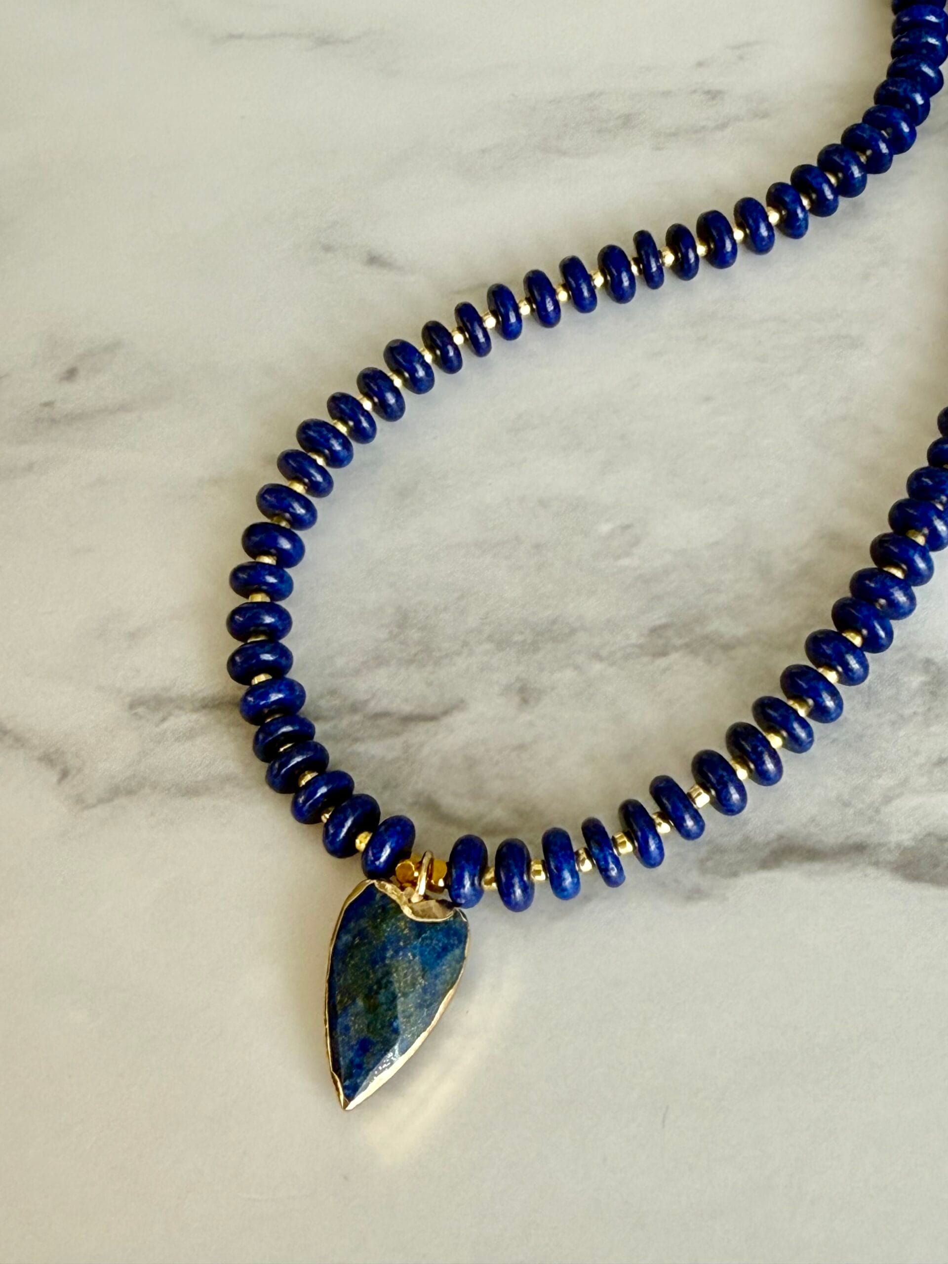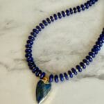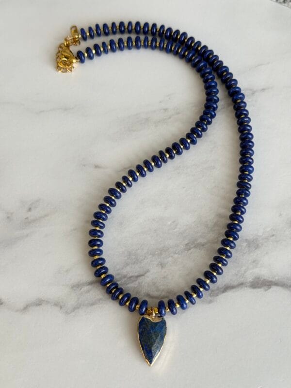 שרשרת אלגנטית עשויה אבני לאזולי לאפיס ייחודית בעבודת יד. שילוב מושלם של טבע, אנרגיה ועיצוב ייחודי. תליון לב עשוי לאזולי בגוון כחול עמוק, עם מסגרת מוזהבת מוסיף מגע של רומנטיקה וסטייל.