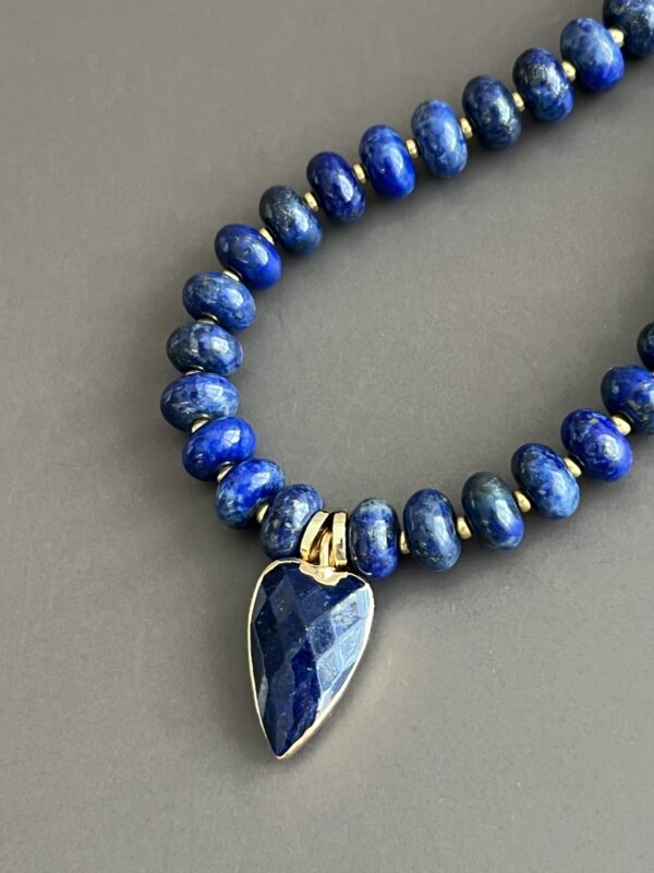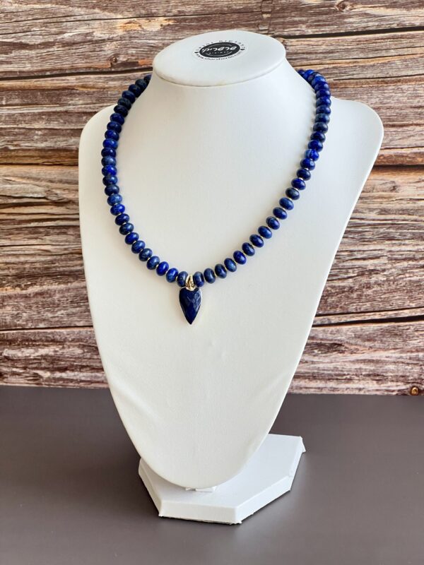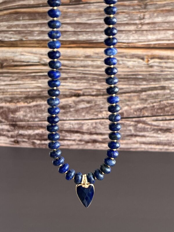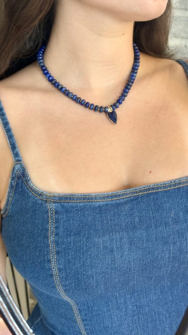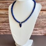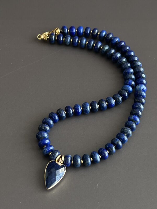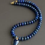שרשרת אלגנטית עשויה אבני לאזולי לאפיס ייחודית בעבודת יד. שילוב מושלם של טבע, אנרגיה ועיצוב ייחודי. תליון לב עשוי לאזולי בגוון כחול עמוק, עם מסגרת מוזהבת מוסיף מגע של רומנטיקה וסטייל.